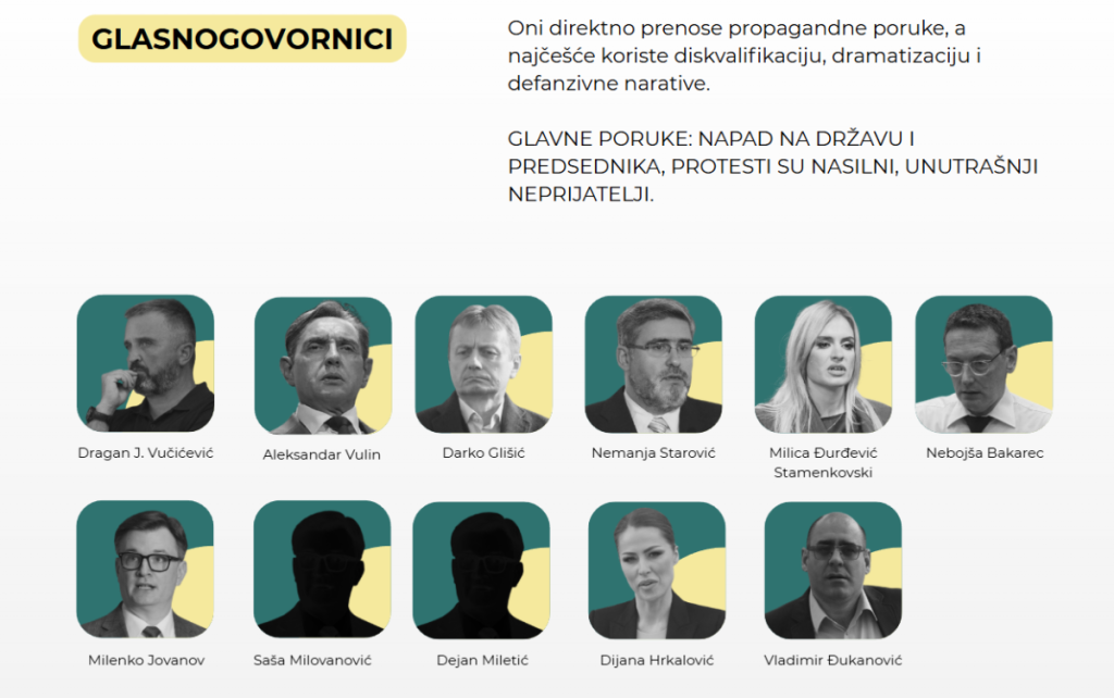 Pored ove grupe, CRTA i Istinomer objavili su još šest podgrupa: "Moralni arbitri", "Glasogovornici", "Ideološki čuvari", "Promoteri uspeha", "Legitimizatori" i "Bezbednosni operativci".