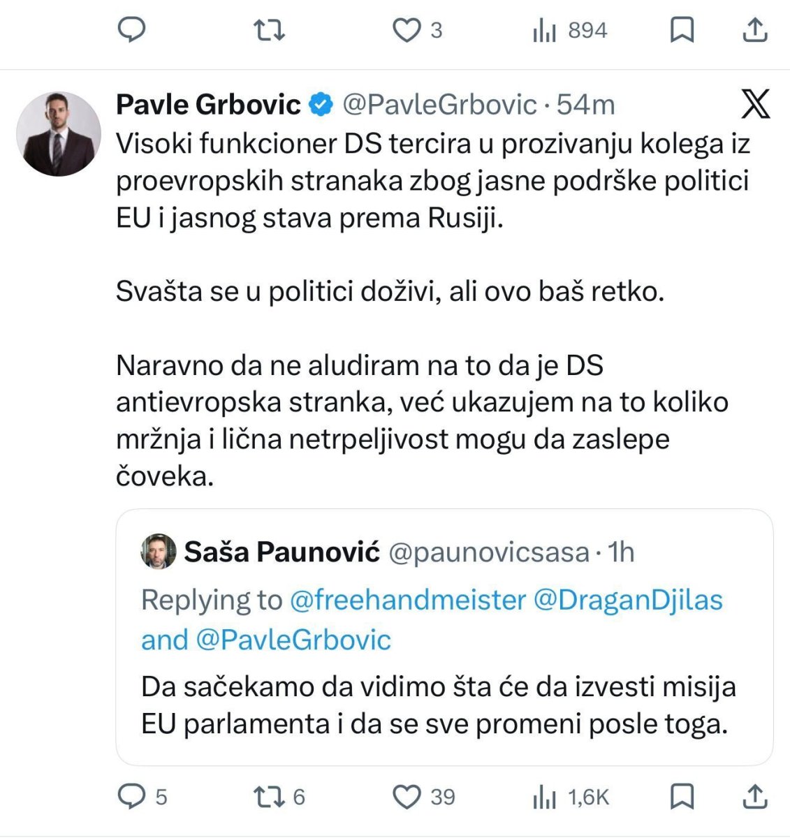 "Visoki funkcioner DS tercira u prozivanju kolega iz proevropskih stranaka zbog jasne podrške politici EU i jasnog stava prema Rusiji. Svašta se u politici doživi, ali ovo baš retko. Naravno da ne aludiram na to da je DS antievropska stranka, već ukazujem na to koliko mržnja i lična netrpeljivost mogu da zaslepe čoveka", napisao je Grbović, a preneo b92.
