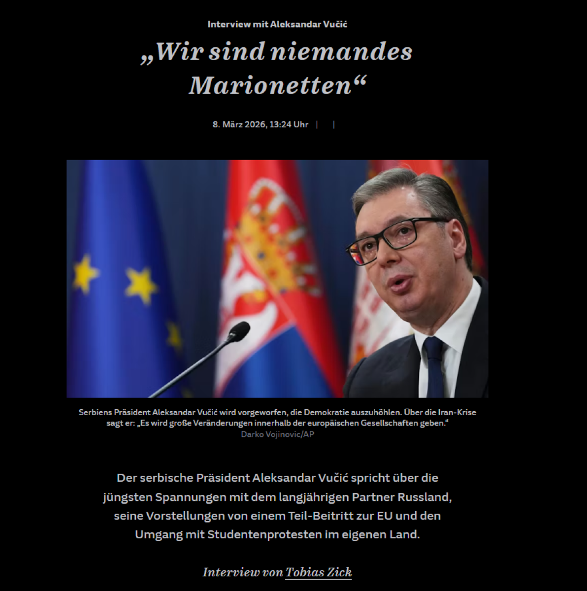 U razgovoru koji je vodio nemački novinar Tobijas Cik, Vučić je odgovorio na čitav spektar pitanja, ali su je neuralnička tačka razgovora odnos Srbije prema SAD, prema EU i prema Rusiji.