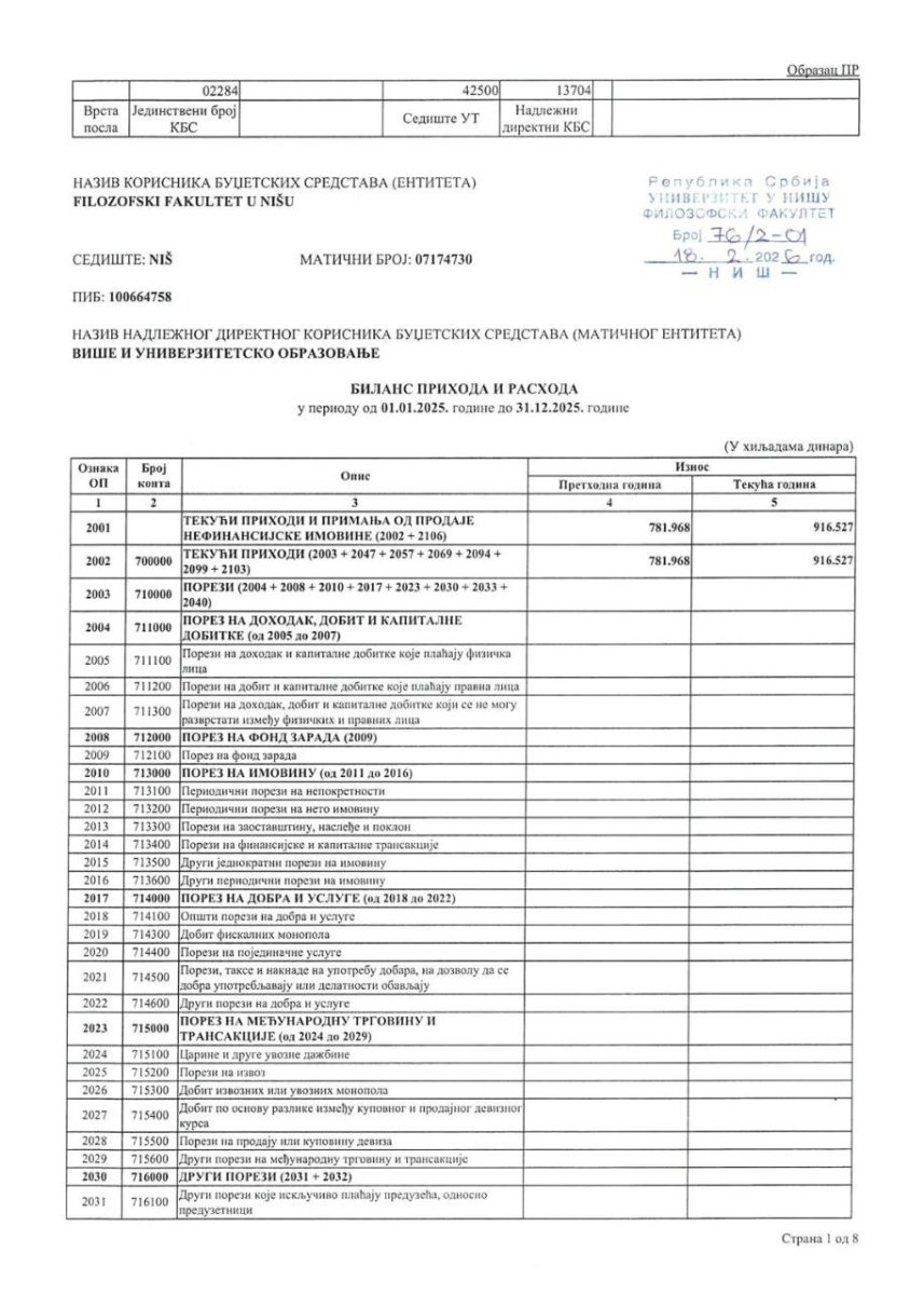 To pokazuje zvaničan dokument ove visokoškolske ustanove: Bilans prihoda i rashoda - prema kojem su tekući prihodi u 2025. godini iznosili 916.525.000 dinara.