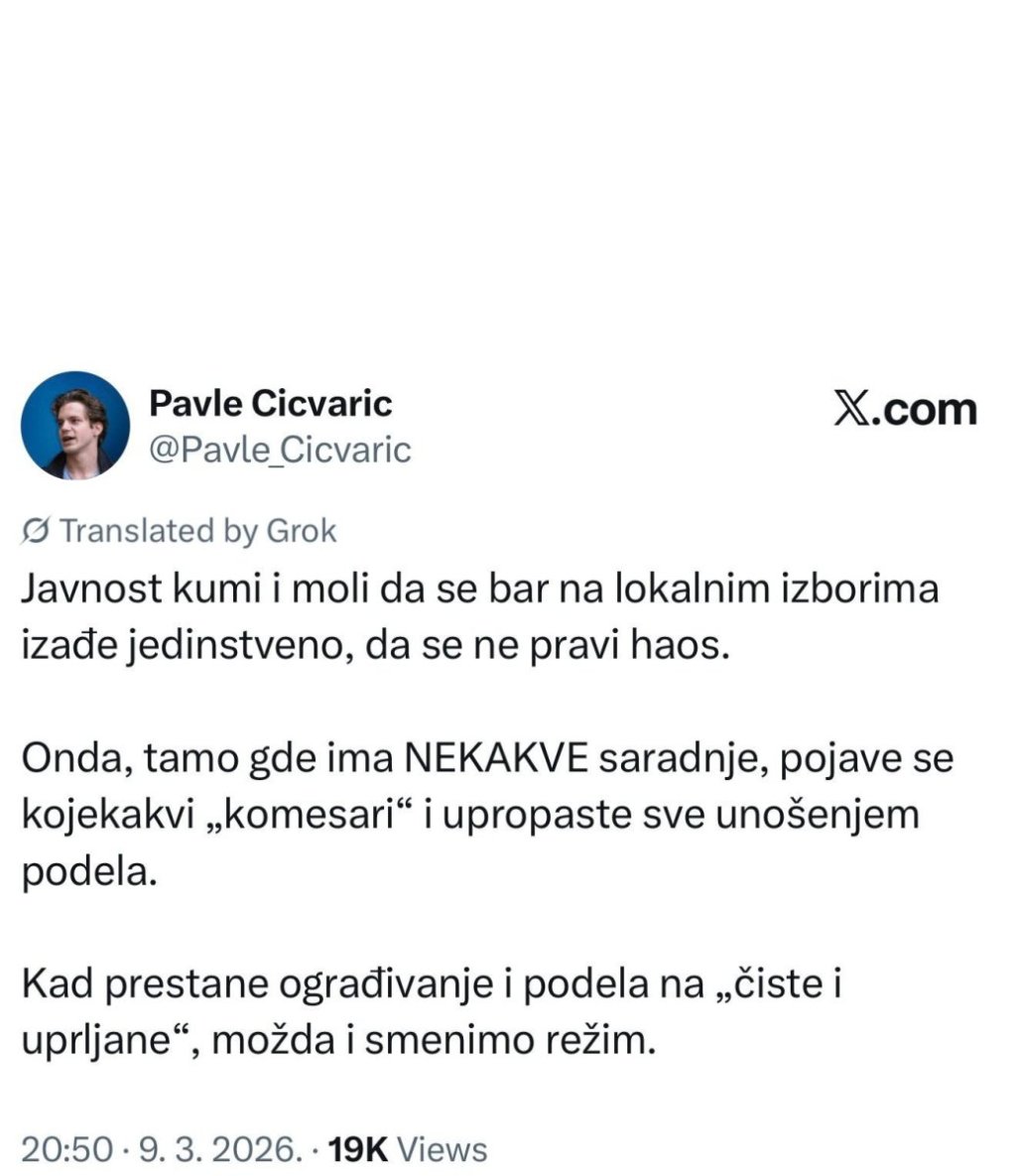 "Javnost kumi i moli da se bar na lokalnim izborima izađe jedinstveno, da se ne pravi haos. Onda, tamo gde ima nekakve saradnje, pojave se kojekakvi ‘komesari’ i upropaste sve unošenjem podela", napisao je Cicvarić.