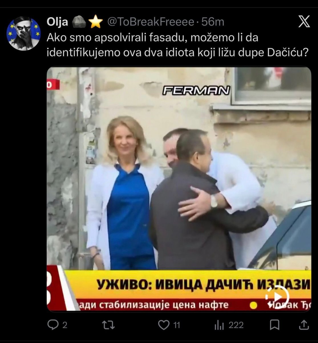 - Ako smo apsolvirali fasadu, možemo li da identifikujemo ova dva idiota koja ližu du*e Dačiću? - glasi ova zastrašujuća objava.