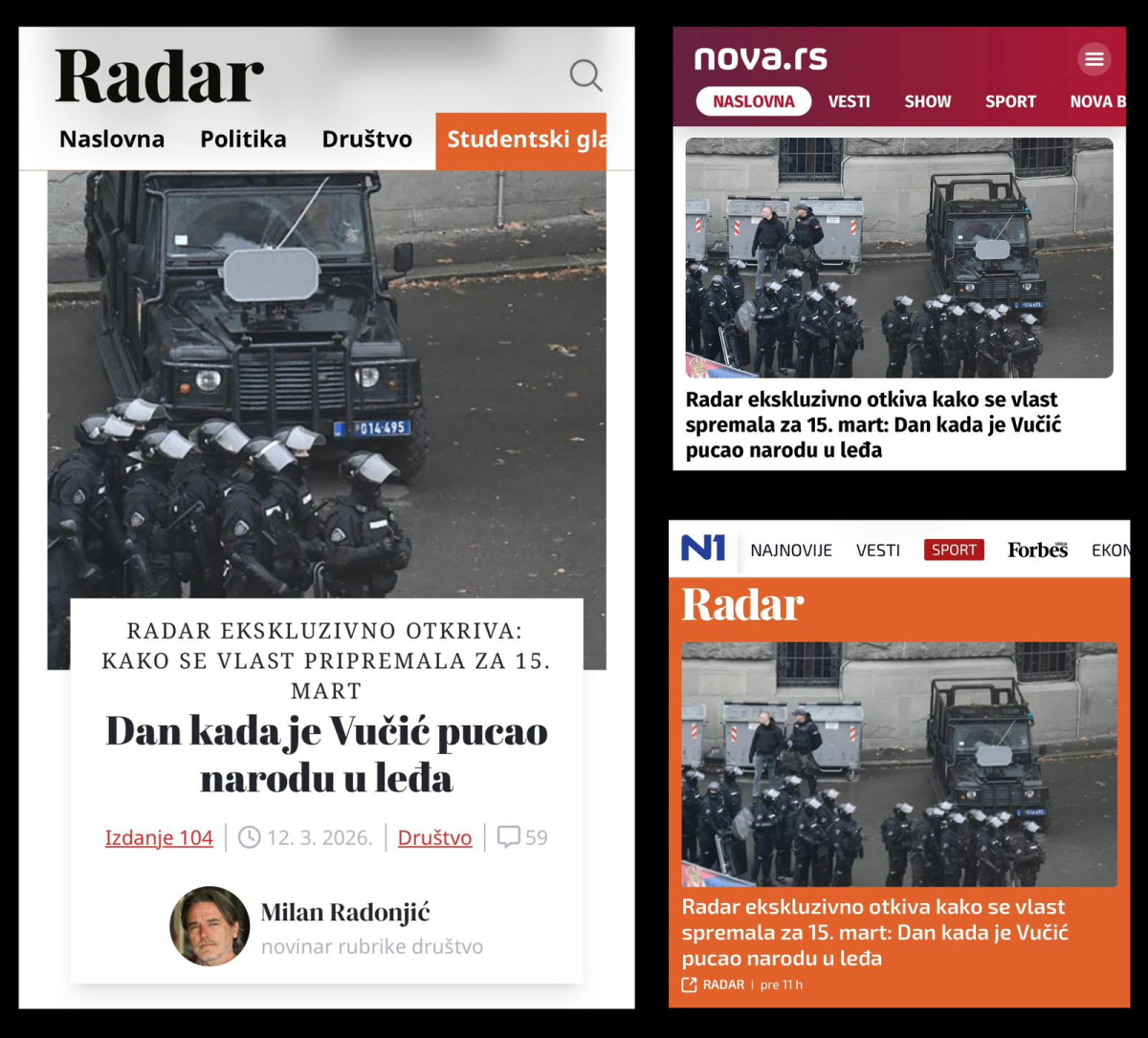 "Dan kada je Vučić narodu pucao u leđa", naslov je koji povezuje tajkunsko trojstvo Nova S, Radar, N1 i pripoveda o "korišćenju zvučnog topa" 15. marta na protestima u Beogradu.