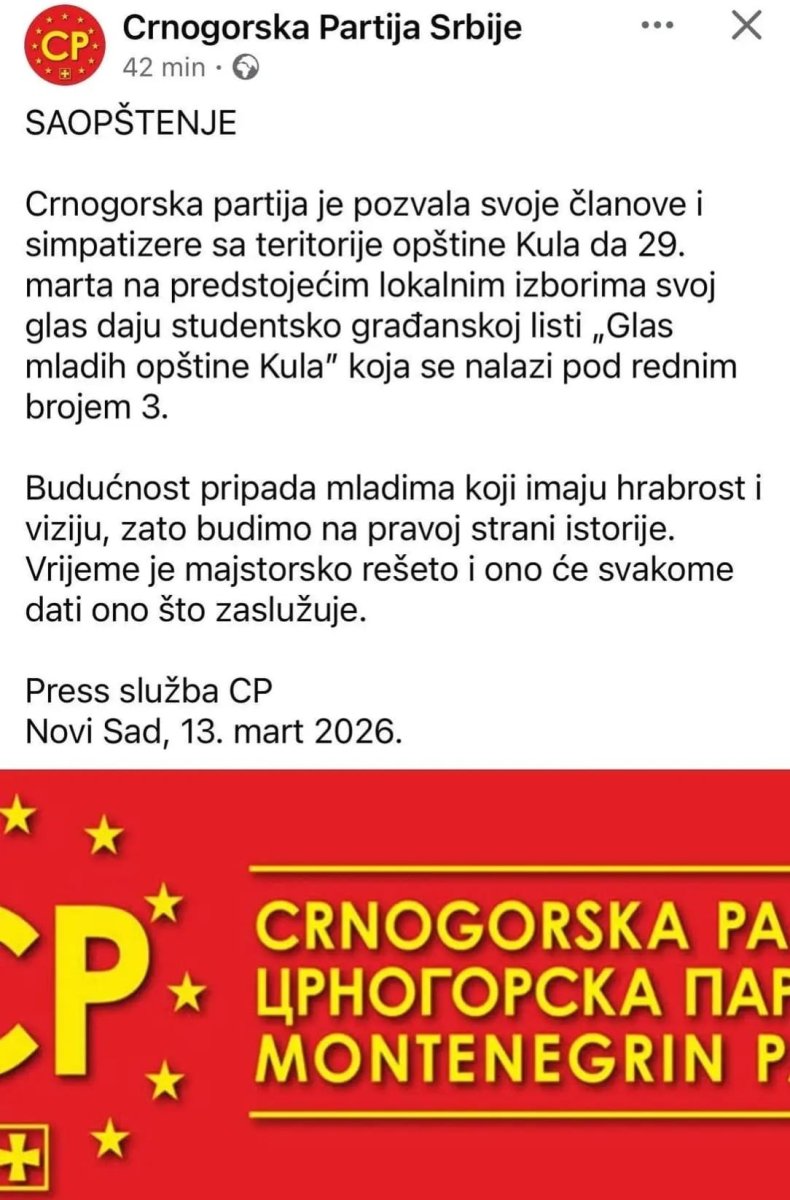 - Crnogorska partija je pozvala svoje članove i simpatizere sa teritorije opštine Kula da 29. marta na predstojećim lokalnim izborima svoj glas daju studentsko građanskoj listi „Glas mladih opštine Kula” koja se nalazi pod rednim brojem 3. Budućnost pripada mladima koji imaju hrabrost i viziju, zato budimo na pravoj strani istorije. Vreme je majstorsko rešeto i ono će svakome dati ono što zaslužuje - navode u skandaloznom saopštenju.