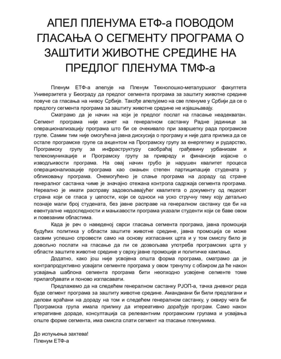 Dok "jedni pišu, drugi kreče", a najnoviji dopis sa Elektrotehničkog fakulteta u Beogradu hitno je pušten kao apel da se ne prihvataju zahtevi sa plenuma Tehnološko-metalurškog fakulteta.