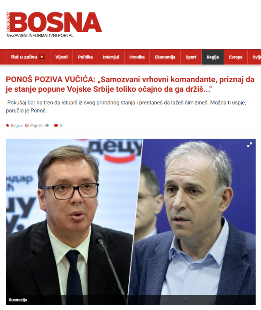 Tako je džihadistička Slobodna Bosna, medijska trovačnica zvaničnog Sarajeva, objavila tekst u kom se prenete Ponoševe reči da je Vojska Srbije u očajnom stanju.