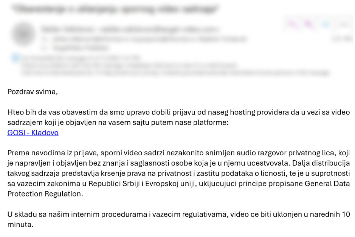 - Hteo bih da vas obavestim da smo upravo dobili prijavu od našeg hosting provajdera da u vezi sa video sadržajem koji je objavljen na vašem sajtu putem naše platforme: GOSI-Kladova, prema navodima iz prijave sporni video sadrži nezakonito snimljen audio razgovor privatnog lica koje je napravljen bez znanja i saglasnosti osobe koja je u njemu učestvovalo. Dalje distribucija takvog sadržaja predstavlja kršenje prava na privatnost i zaštitu podataka o ličnosti, te je u suprotnosti sa važećim zakononima u Republici Srbiji i Evropskoj uniji - navodi se između ostalog u dopisu uz napomenu da će video biti uklonjen u roku od 10 minuta što je u urađeno.
