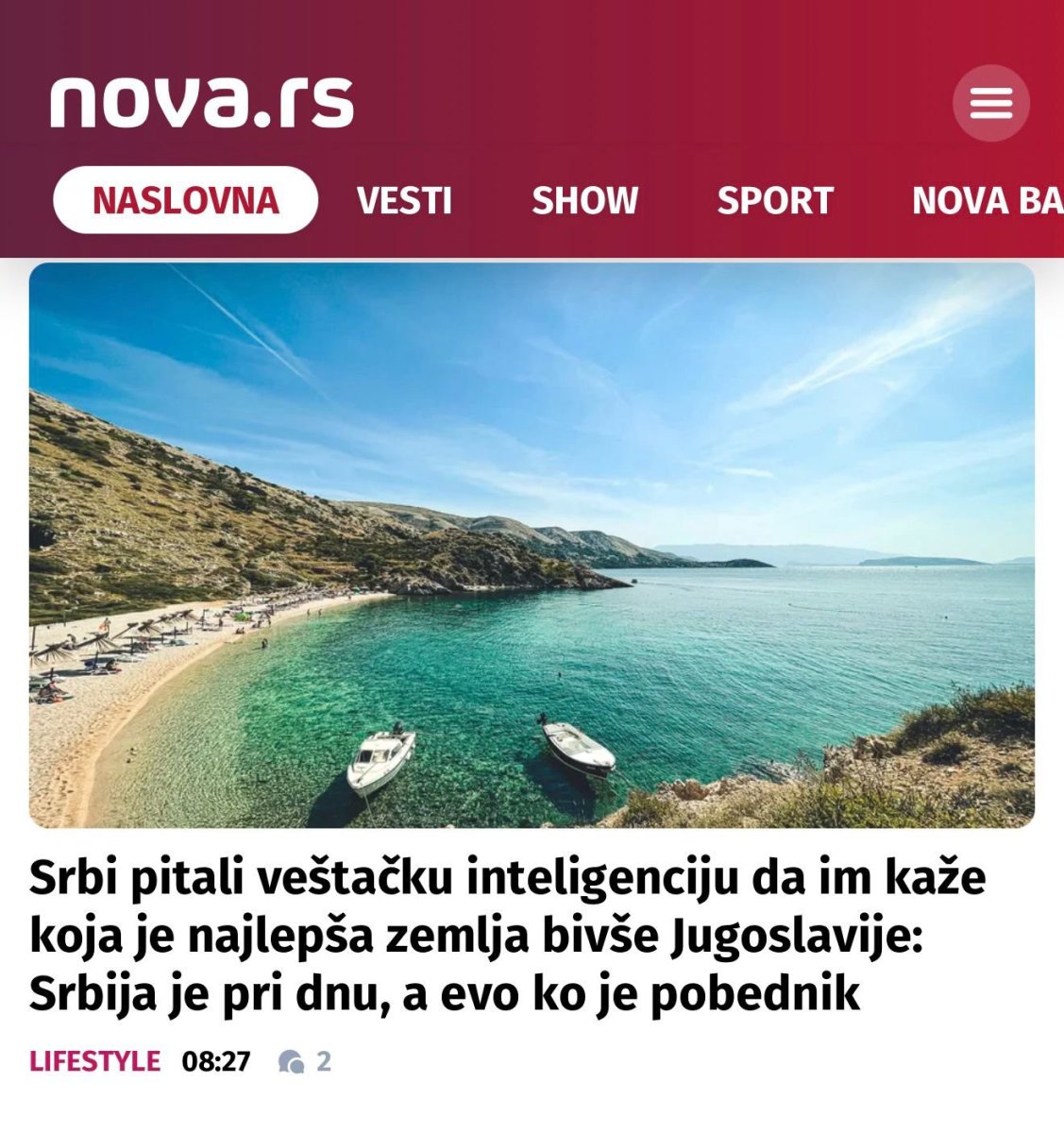Tačnije, na portalu Nova S pojavio se tekst sa naslovom "Srbi pitali veštačku inteligenciju da im kaže koja je najlepša zemlja bivše Jugoslavije: Srbija je pri dnu, a evo ko je pobednik".