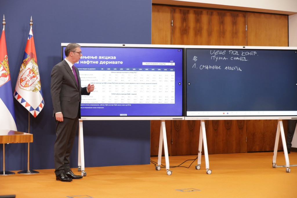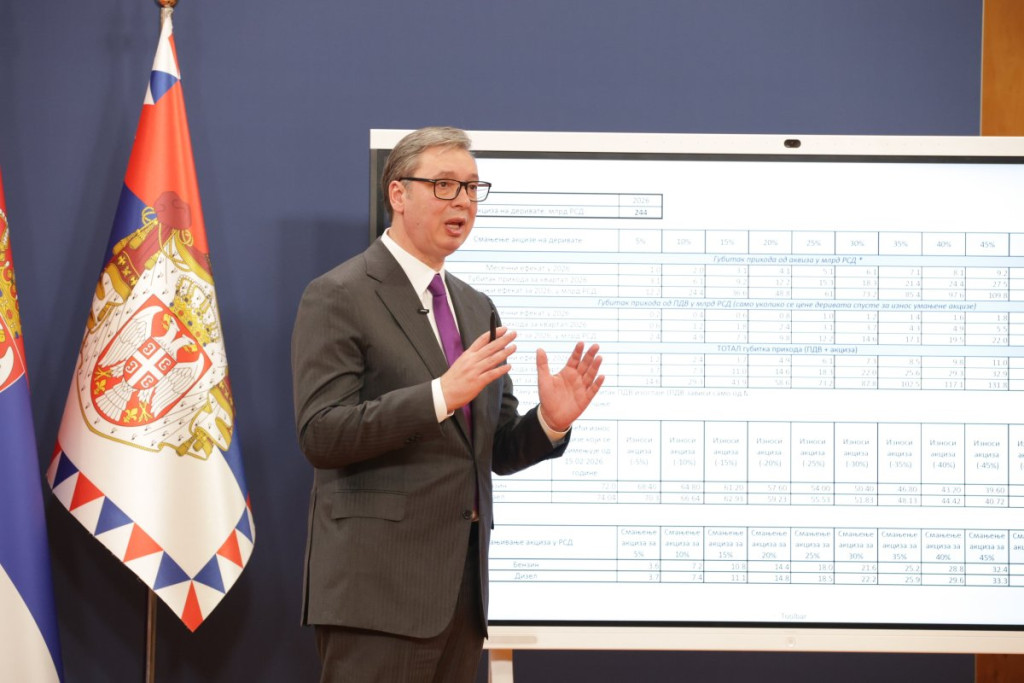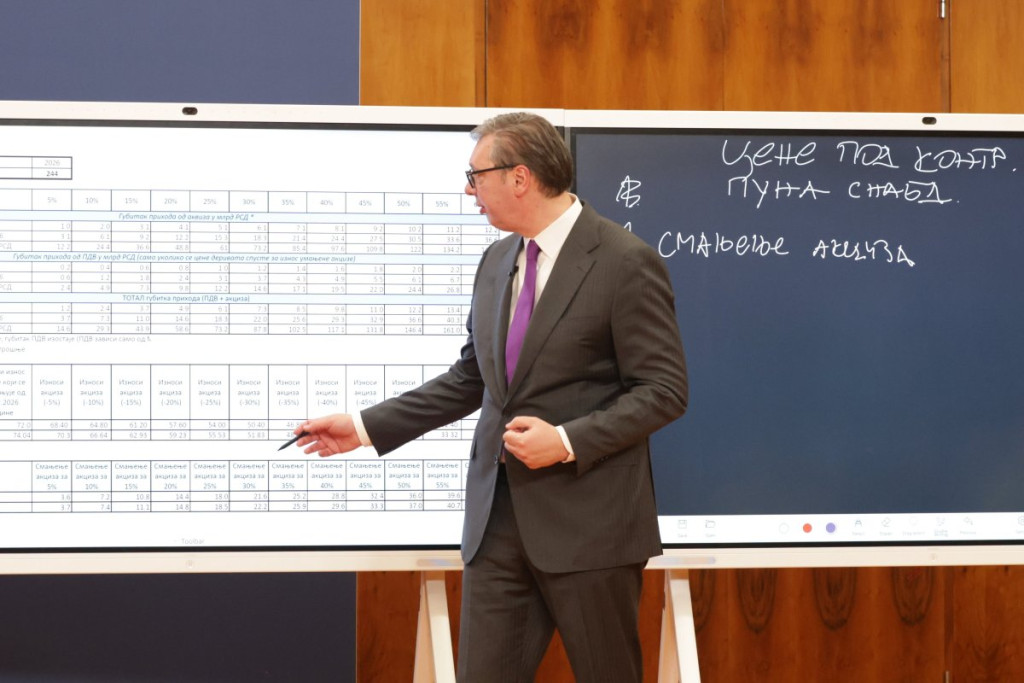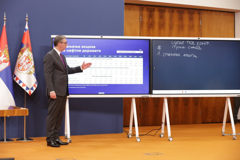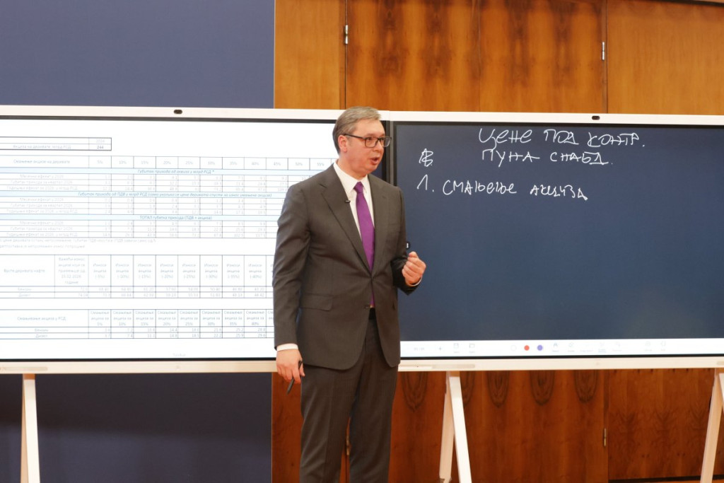- Objasniću kako to izgleda na današnjoj ceni, ali hoću da vam pokažem kako ćemo to da radimo. Da vidite šta će država da uradi, i to može da uradi samo onaj ko ima značajne finansijske bafere. Mi to imamo, ali reći ću i gde su problemi. Kada pogledate akcizu, koju smanjite za 20 odsto, mi gubimo u prihodima 4,1 milijardu, što je 35 miliona evra! Da držimo samo na 20 odsto, na godišnjem nivou to vam je 420 miliona evra - rekao je predsednik.