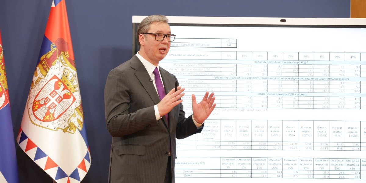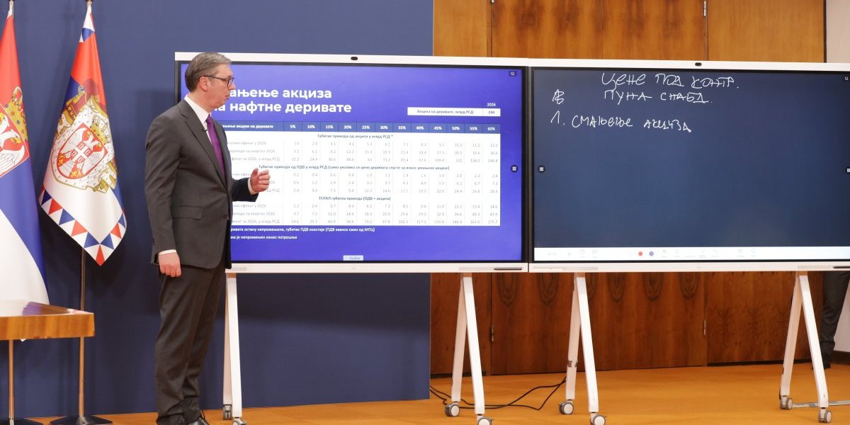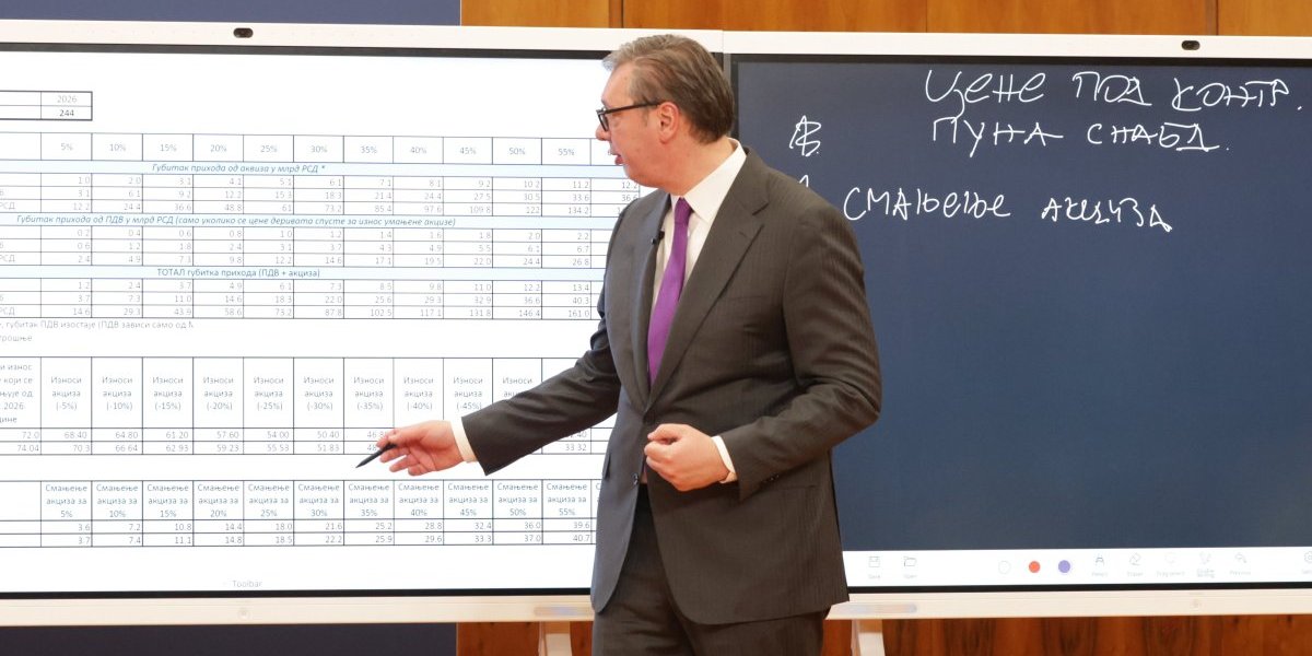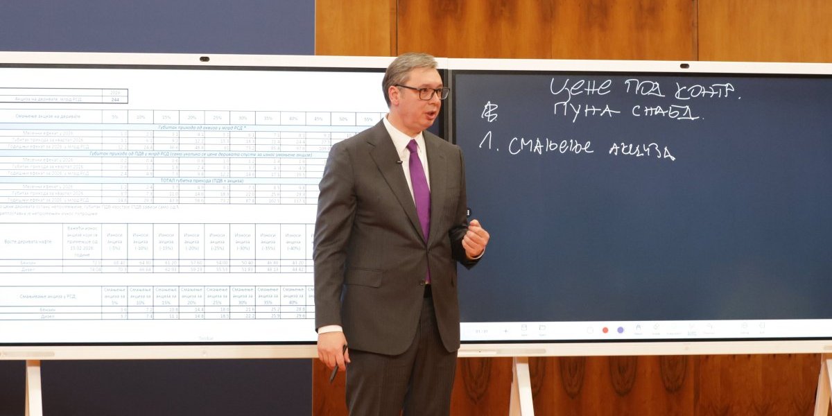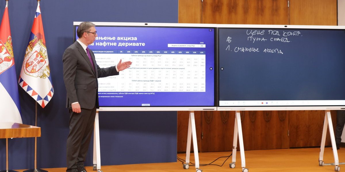 - Objasniću kako to izgleda na današnjoj ceni, ali hoću da vam pokažem kako ćemo to da radimo. Da vidite šta će država da uradi, i to može da uradi samo onaj ko ima značajne finansijske bafere. Mi to imamo, ali reći ću i gde su problemi. Kada pogledate akcizu, koju smanjite za 20 odsto, mi gubimo u prihodima 4,1 milijardu, što je 35 miliona evra! Da držimo samo na 20 odsto, na godišnjem nivou to vam je 420 miliona evra - rekao je predsednik.