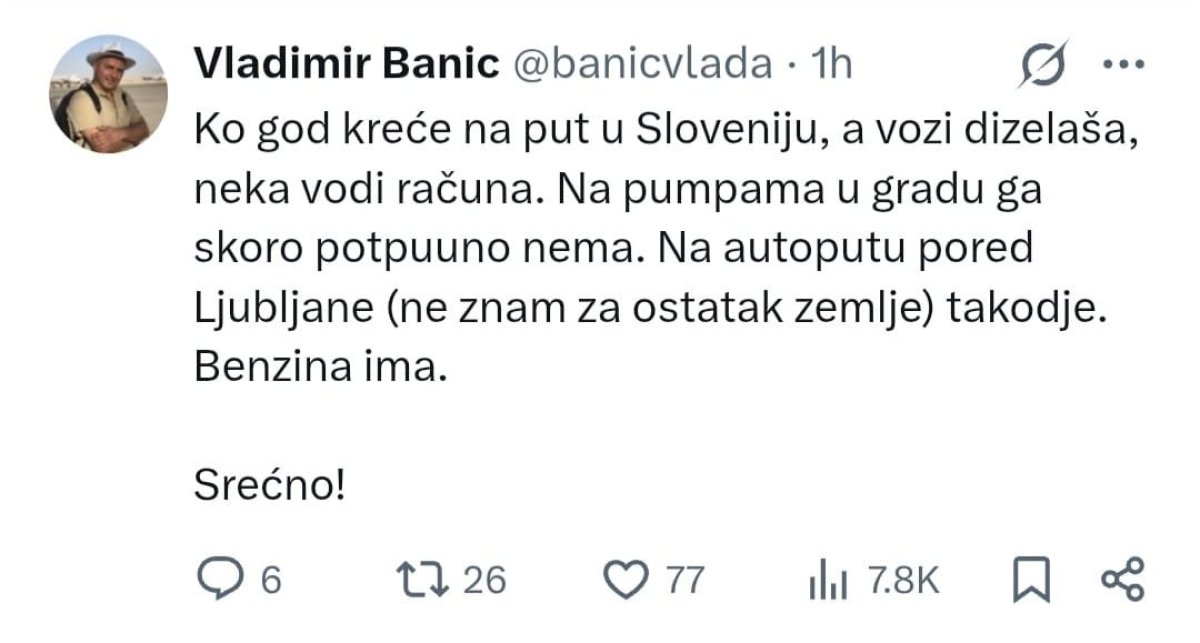 - Ko god kreće na put u Sloveniju, a vozi dizelaša, neka vodi računa. Na pumpama u gradu ga skoro potpuuno nema. Na autoputu pored Ljubljane (ne znam za ostatak zemlje) takodje. Benzina ima. Srećno! - poručio je Vladimir Banić.