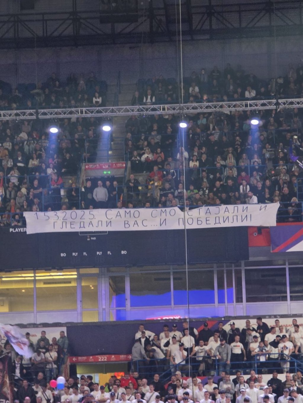 Naime, kako se može videti na fotografiji - u prepunoj Areni razvijen je ogroman transparent: "15.03.2025 Samo smo stajali i gledali vas i pobedili. "