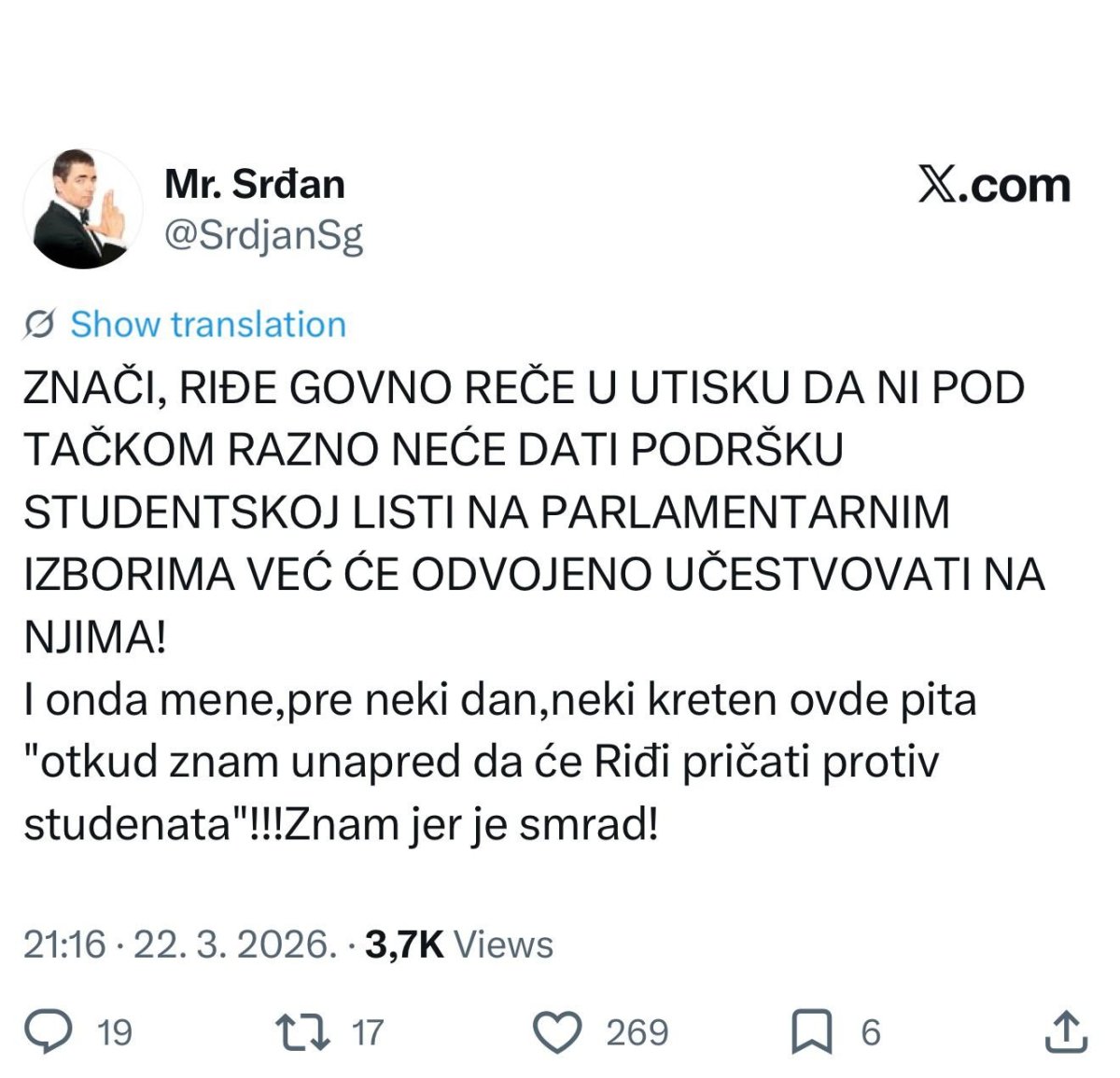 - Znači, riđe go*no reče u "Utisku" da ni pod tačkom razno neće dati podršku studentskoj listi na parlamentarnim izborima, već će odvojeno učestvovati na njima!I onda mene,pre neki dan, neki kreten ovde pita "otkud znam unapred da će Riđi pričati protiv studenata"!!! Znam jer je smrad! - napisao je jedan blokaderski tviteraš.