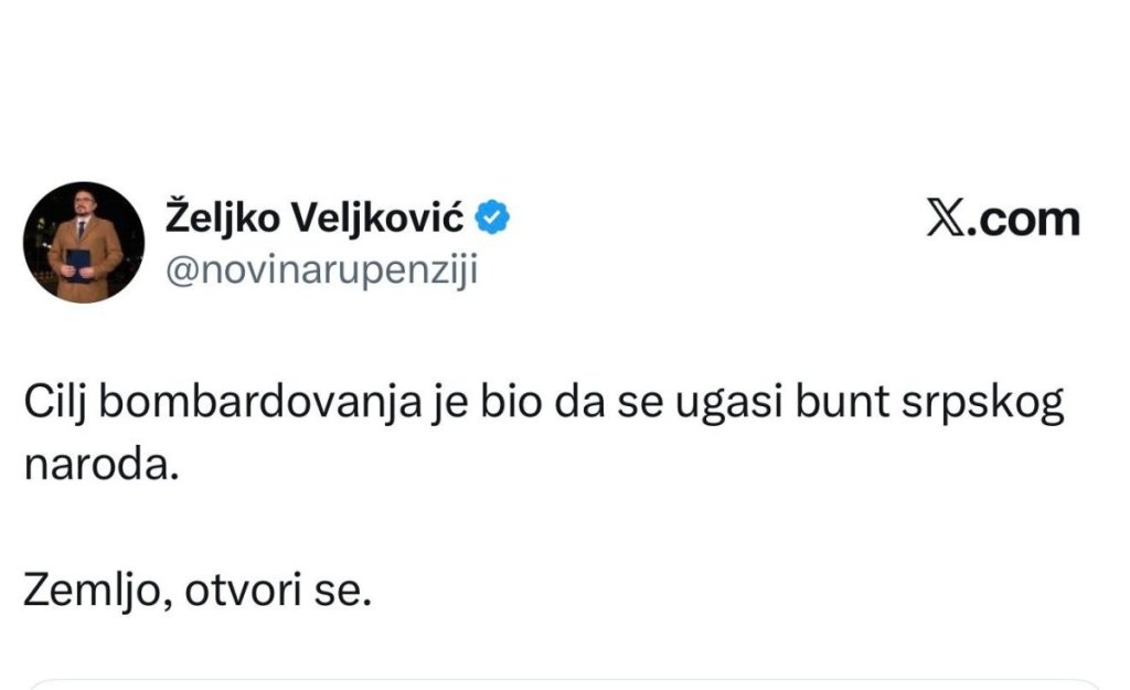 Ali, to nije sve, izgleda da je Veljković u akciji legalizovanja i opravdavanja NATO agresije pa je na društvenoj mreži Iks napisao da je "Cilj bombardovanja bio da se ugasi bunt srpskog naroda. Zemljo, otvori se."