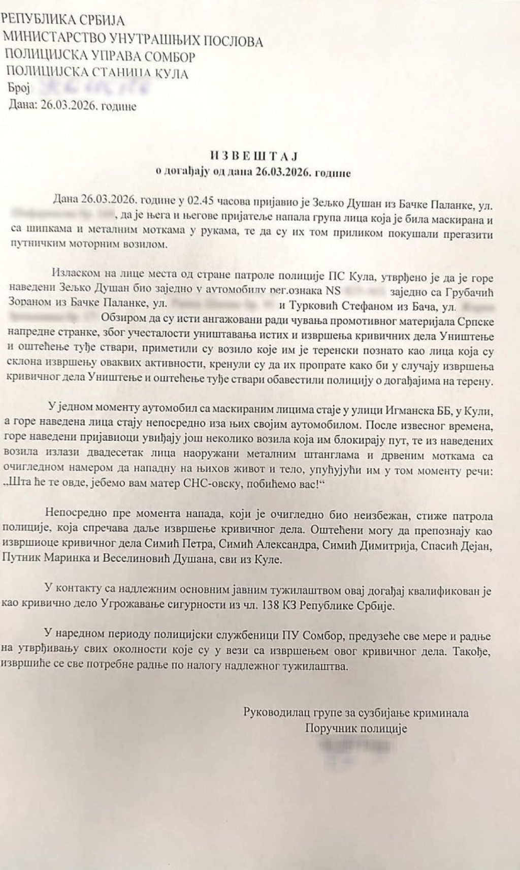 Pripadnici Ministarstva unutrašnjih poslova u Somboru su u službene prostorije doveli D. S. (1996) iz Kule i identifikovali još dve osobe. Sumnja se da su oni bili u grupi više lica koja su noćas, oko 2.45 časova u Kuli, vređali i pretili trojici aktivista Srpske napredne stranke.