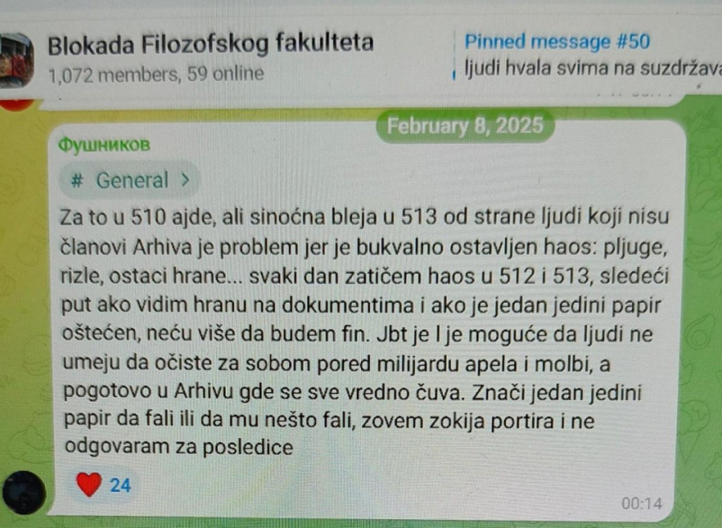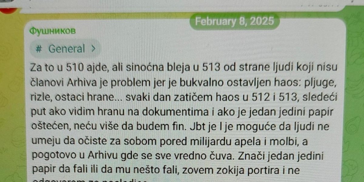 - Apelujem da se u 510, 512 i 513 ne bleji, pošto nam je uprava te učionice ustupila u određene svrhe koje ne podrazumevaju sedeljke, žurke i ostale vidove zajebancija koje se inače sprovode po drugim učionicama. Bukvalno je uprava naglasila da se vodi računa o tim učionicama iz više razloga, da ne bude da se brecam bezveze. Pogotovo je strogo zabranjeno ulaziti u 512 i 513 (prostorije Arhiva) ukoliko niste član RGA zbog bezbednosti dokumentacije i opreme koja se tamo nalazi... Evo doslovno vas molim da ne zloupotrebljavate dobru volju uprave jer na kraju ispaštamo mi koji smo izboksovali otvaranje 5. sprata zarad blokade - glasi poruka iz blokaderske grupe u koju smo imali uvid.