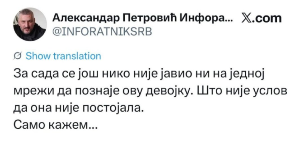 - Za sada se još niko nije javio na na jednoj mreži da poznaje ovu devojku. Što nije uslov da ona nije postajala. Samo kažem - rekao je on.