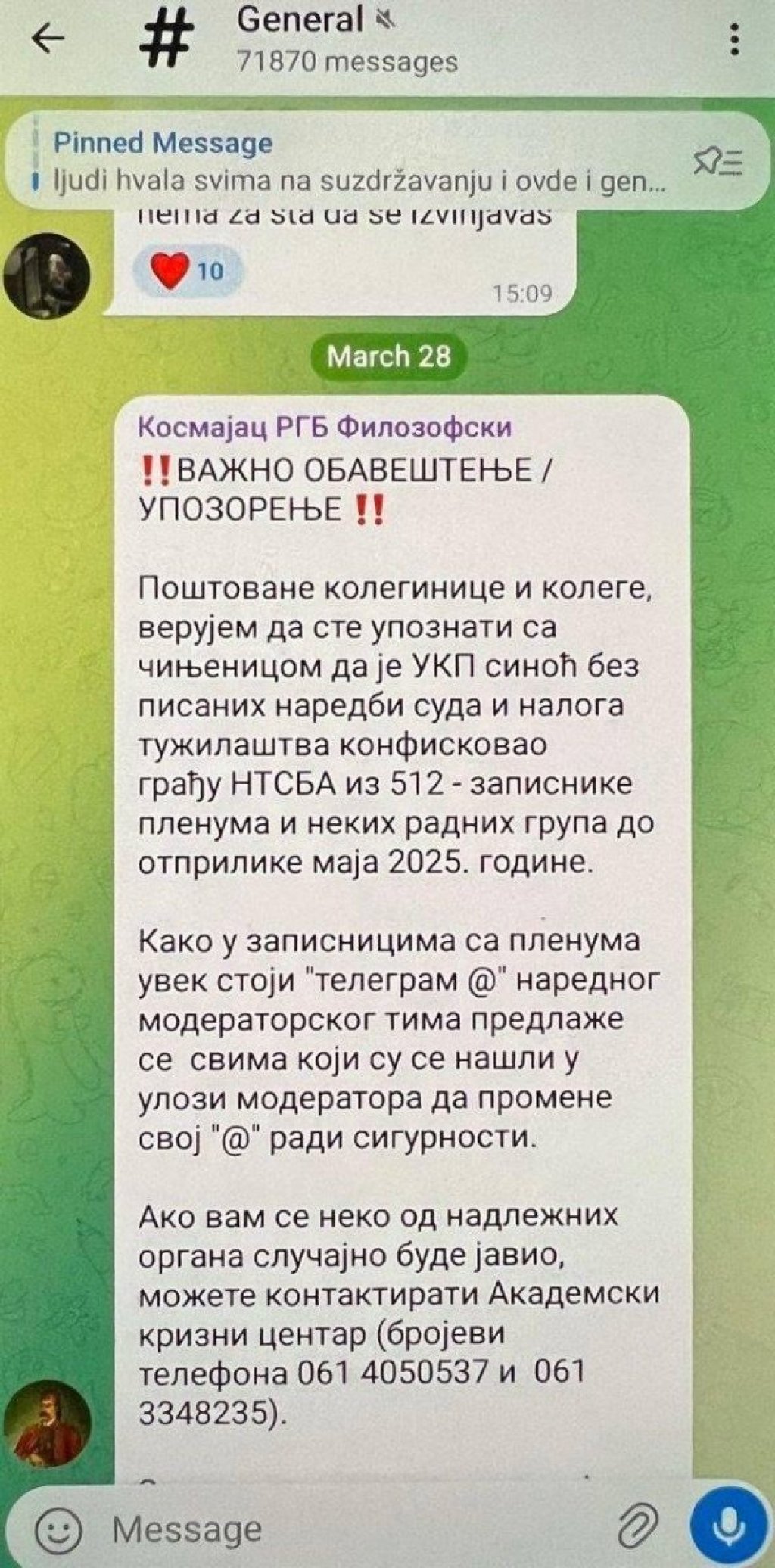 - Kako u zapisnicima s plenuma uvek stoji "telegram @" narednog moderatorskog tima predlaže se svima koji su se našli u ulozi moderatora da promene svoj "@". Ako vam se neko od nadležnih bude javio možete kontaktirati Akademski krizni centar - upozorio je Kosmajac svoje istomišljenike zgubidane.