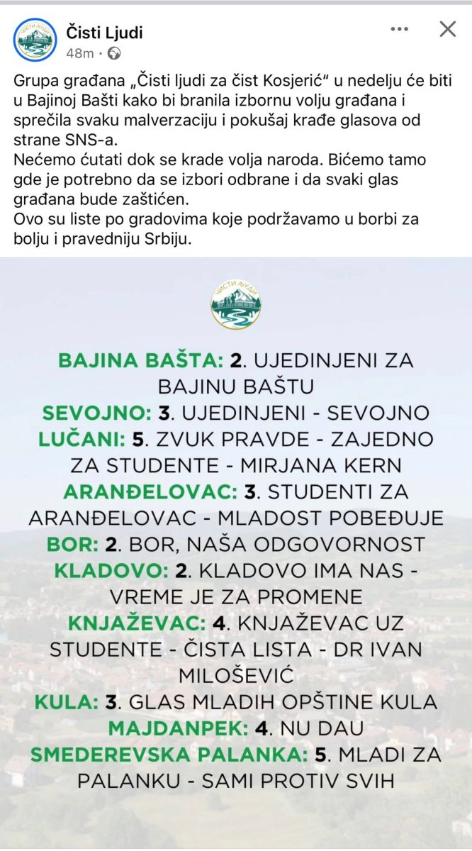 U istom postu oni su naveli i koje liste po gradovima i opštinama podržavaju.