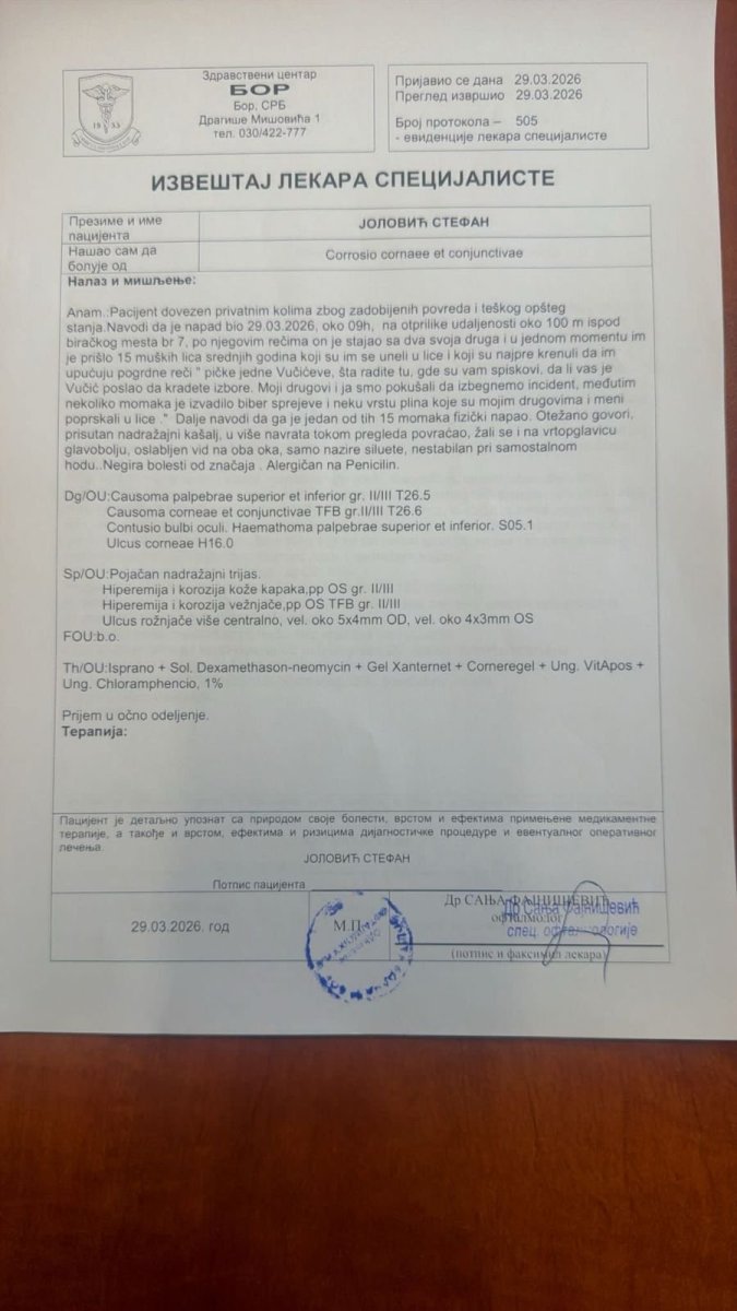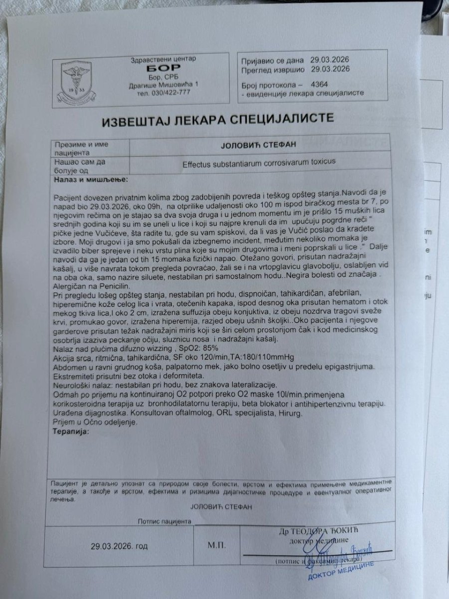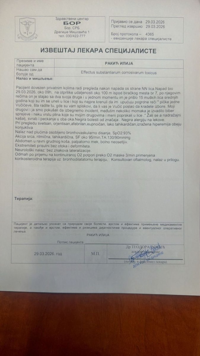 Napadnuti pacijent je povrede zadobio ispred biračkog mesta, u Boru, gde su ga blokaderi nazvali "Vučićevim likom" i isprskali hemikalijama.