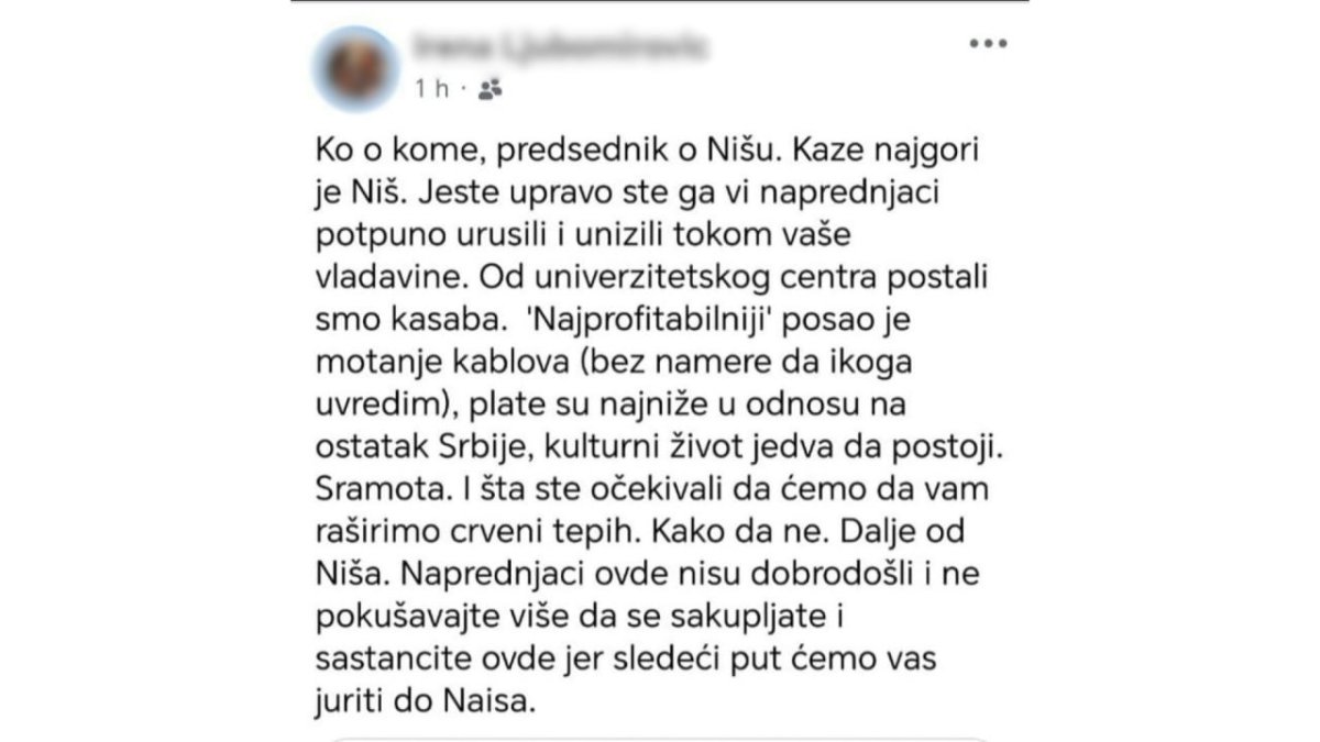 Članica Senata Univerziteta u Nišu i profesorka Filozofskog fakulteta otvoreno preti nasiljem političkim neistomišljenicima i to uz pesme ustaše Marka Perkovića Tompsona.