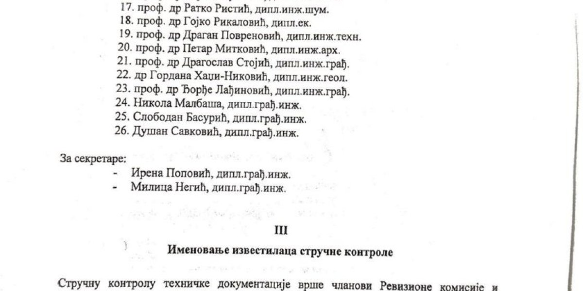 U sastavu te komisije, kako se jasno vidi iz dokumentacije, pod rednim brojem 13 nalazi se rektor Univerziteta u Beogradu Vladan Đokić, dok je pod brojem 3 navedeno ime Vladana Kuzmanovića, bivšeg dekana Građevinskog fakulteta. Komisiju su činili i brojni profesori i inženjeri različitih struka, a njen zadatak bio je da izvrši stručnu kontrolu i da konačno mišljenje o ispravnosti projekta.