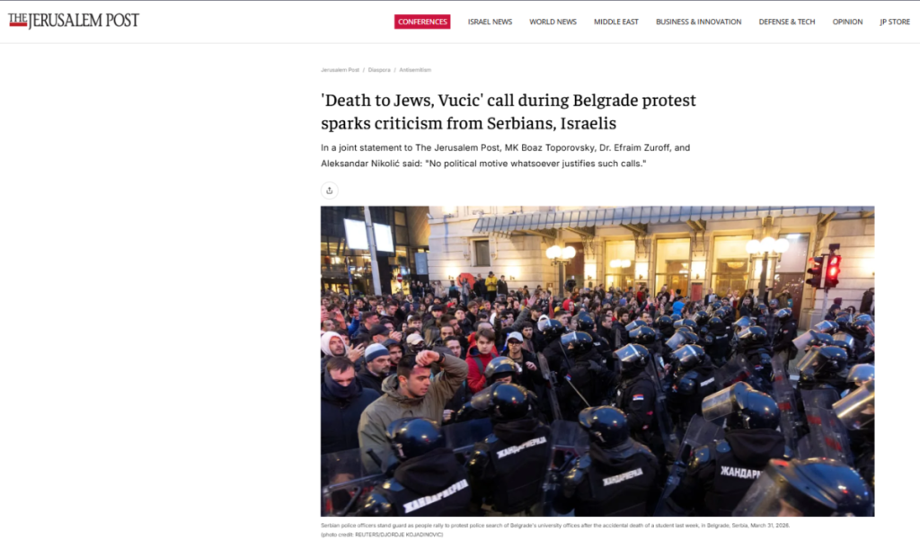 U zajedničkom saopštenju za Džeruzalem post (JP) oni su ocenili da "nikakav politički motiv ne može da opravda takve pozive", opisujući predsednika Srbije Aleksandra Vučića kao "dokazanog prijatelja jevrejskog naroda i države Izrael u najtežim vremenima".