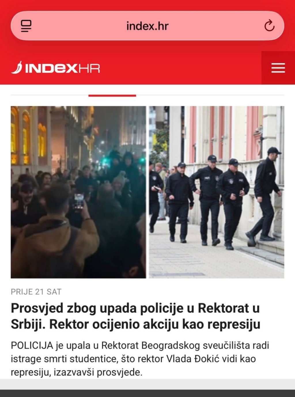 - Protest zbog upada policije u Rektorat u Srbiji. Rektor ocenio akciju kao represiju - navodi se na ovom portalu.