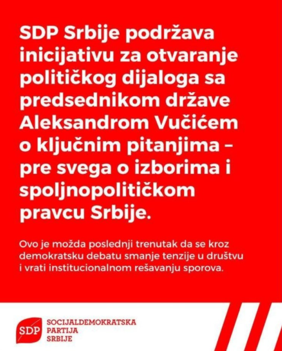 Socijaldemokratska partija Srbije podržava inicijativu za otvaranje političkog dijaloga sa predsednikom države Aleksandrom Vučićem o ključnim pitanjima - pre svega o izborima i spoljnopolitičkom pravcu Srbije.