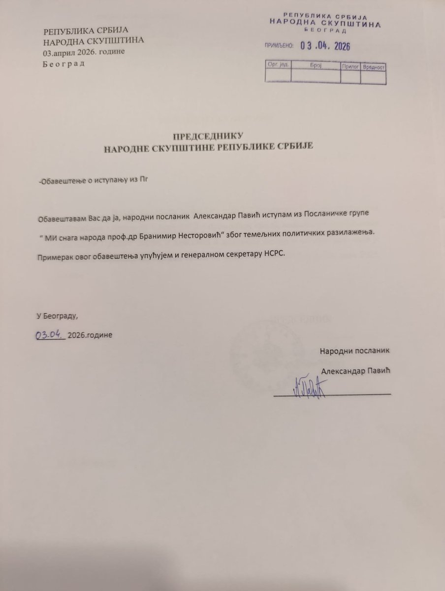 - Obaveštavam Vas da ja, narodni poslanik Aleksandar Pavić istupam iz Poslaničke grupe "MI snaga naroda prof. dr Branimir Nestorović" zbog temeljnih političkih razilaženja - navodi u svojoj zvaničnoj odluci.