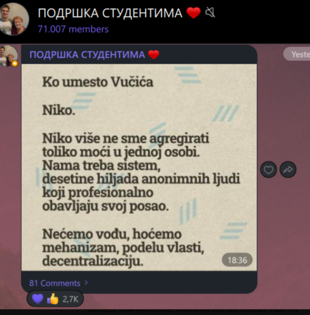 "Ko umesto Vučića? Niko." ali i dodaje se da Srbiji ne treba koncentracija moći u jednoj osobi, što se može protumačiti kao direktna kritika aktuelnog stanja i rukovođenja institucijama, uključujući i univerzitet.