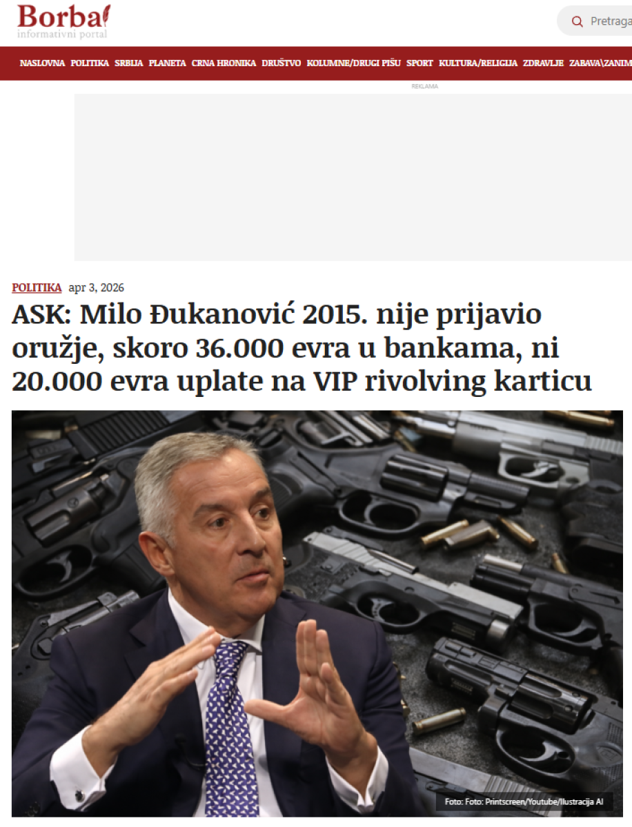 Kako piše podgorička Borba, Đukanović nije informisao Agenciju o gotovinskoj uplati od 20.000 evra na VIP rivolving karticu jedne banke, gotovo 36.000 evra koje je imao u gotovom novcu u drugim bankama, ali ni da poseduje dva komada vatrenog oružja.