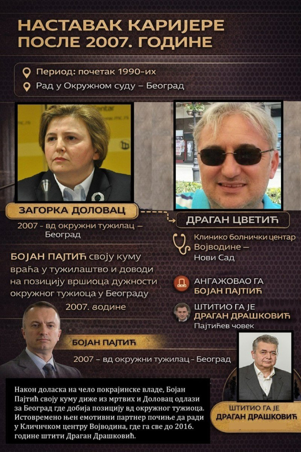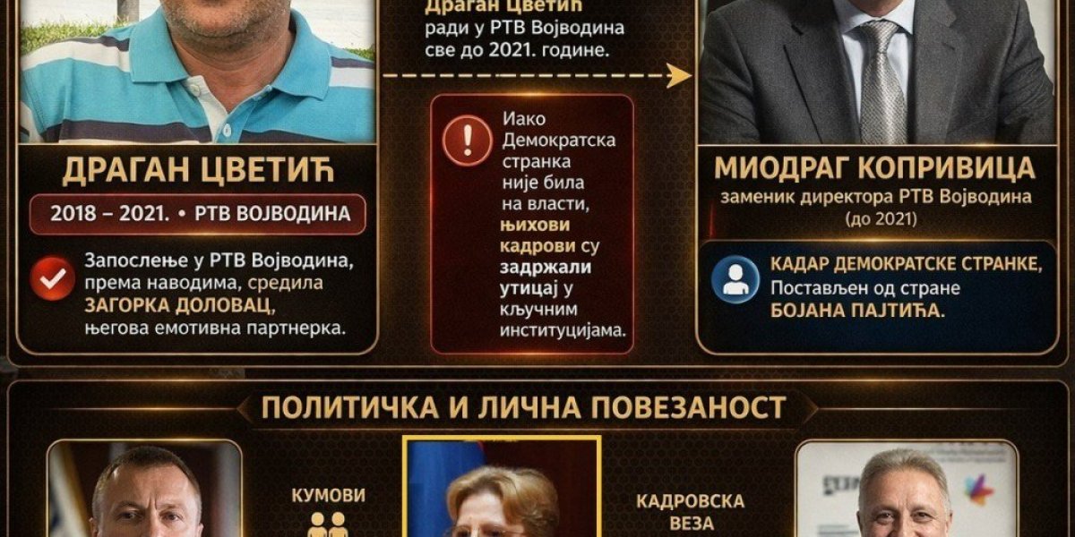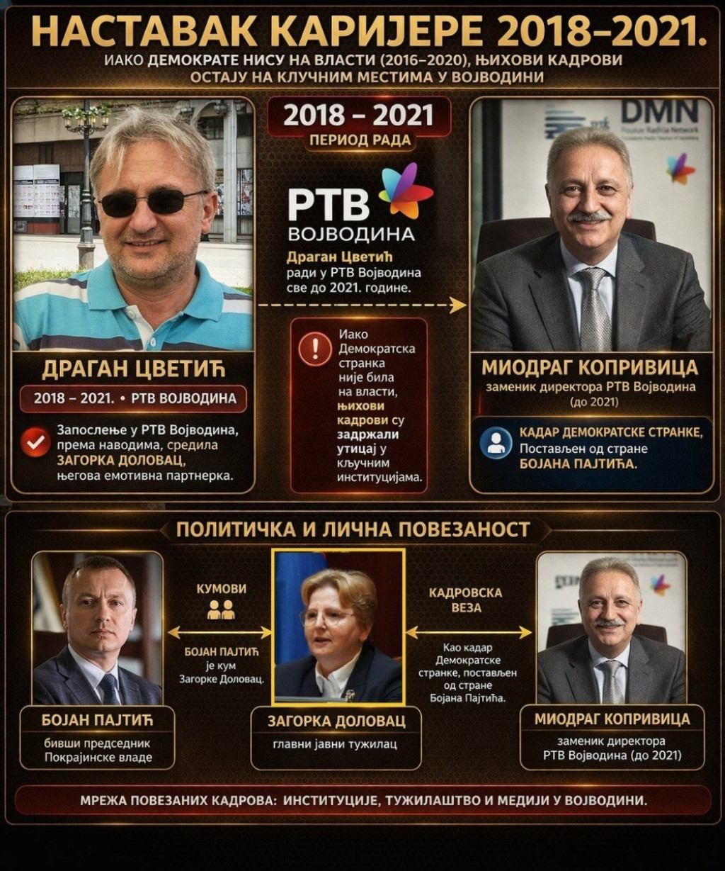 Dolovac upravo njemu duguje svoju uspešnu karijeru. On je svoju kumu Dolovac vratio u tužilaštvo. Paralelno, Cvetić prelazi u Klinički centar Vojvodine po nalogu Pajtića, gde ga sve do 2016. štiti Dragan Drašković, Pajtićev saradnik. Pajtić zatim postavlja Igora Pavličića za gradonačelnika Novog Sada. Time Pajtić zatvara krug DS kadrova na ključnim pozicijama. Od 2018. do 2021. Cvetić prelazi na Radio-televiziju Vojvodine (RTV) gde mu zaštitu pruža Miodrag Koprivica, zamenik direktora RTV. Njega je tamo takođe postavio Pajtić.