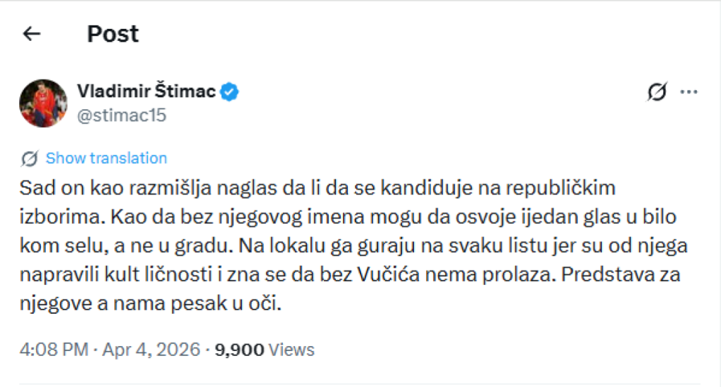 Propali košarkaš i blokader sa dna kace Vladimir Štimac oglasio se ponovo na društvenoj mreži Iks i "briljirao", al' zamalo, u želji da se posluži ironijom i isprovocira predsednika Srbije Aleksandra Vučića.