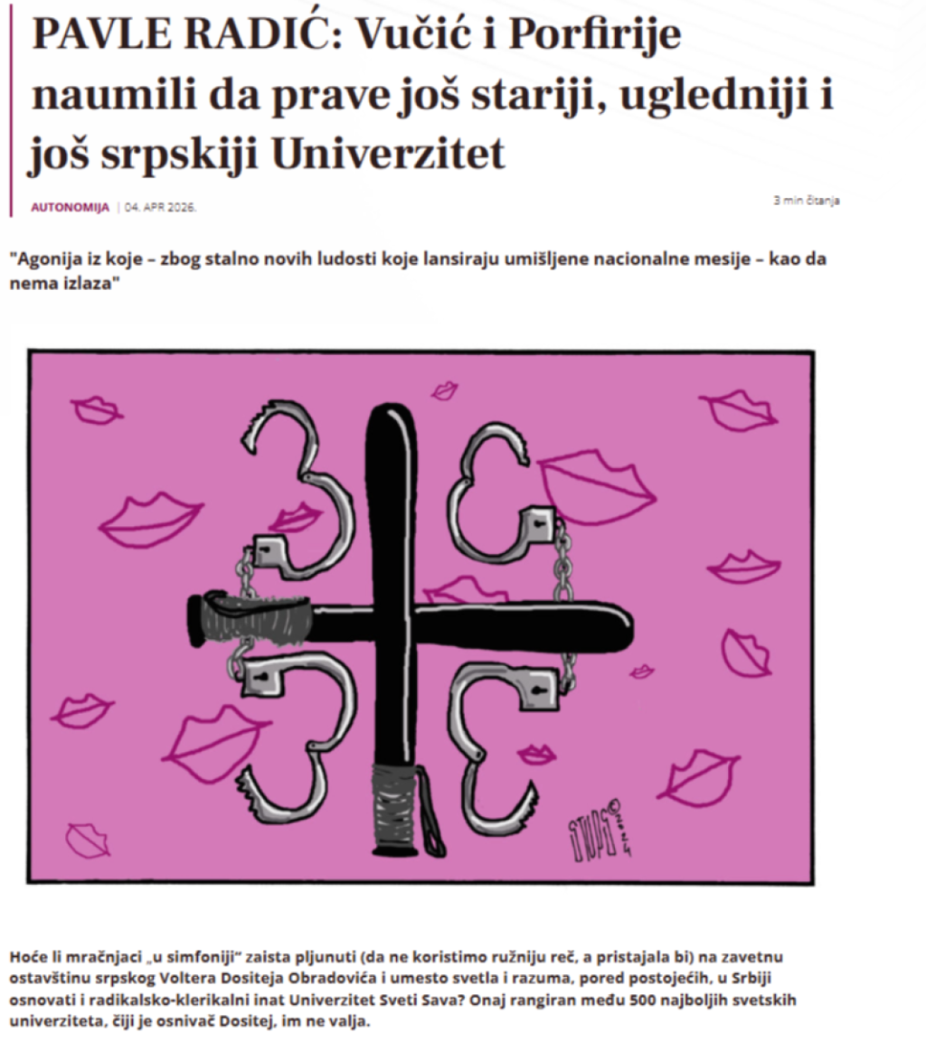Tekst je zapravo "delo" autora Pavla Radića, koji je objavljen s naslovom: "Vučić i Porfirije naumili da prave još stariji, ugledniji i još srpskiji Univerzitet".