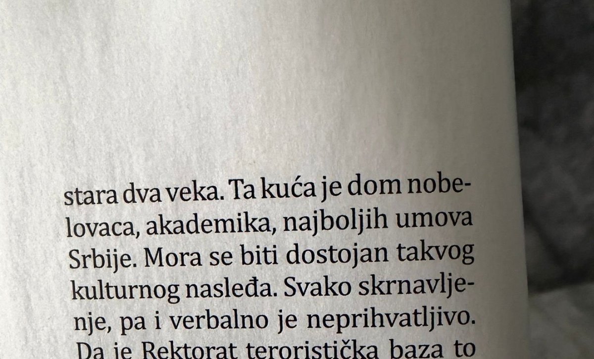 - Ta kuća je dom nobelovaca, akademika, najboljih umova Srbije. Mora biti dostojan takvog kulturnog nasleđa. Svako skrnavljenje, pa i verbalno, je neprihvatljivo - besramno navodi Đokić za "Radar".