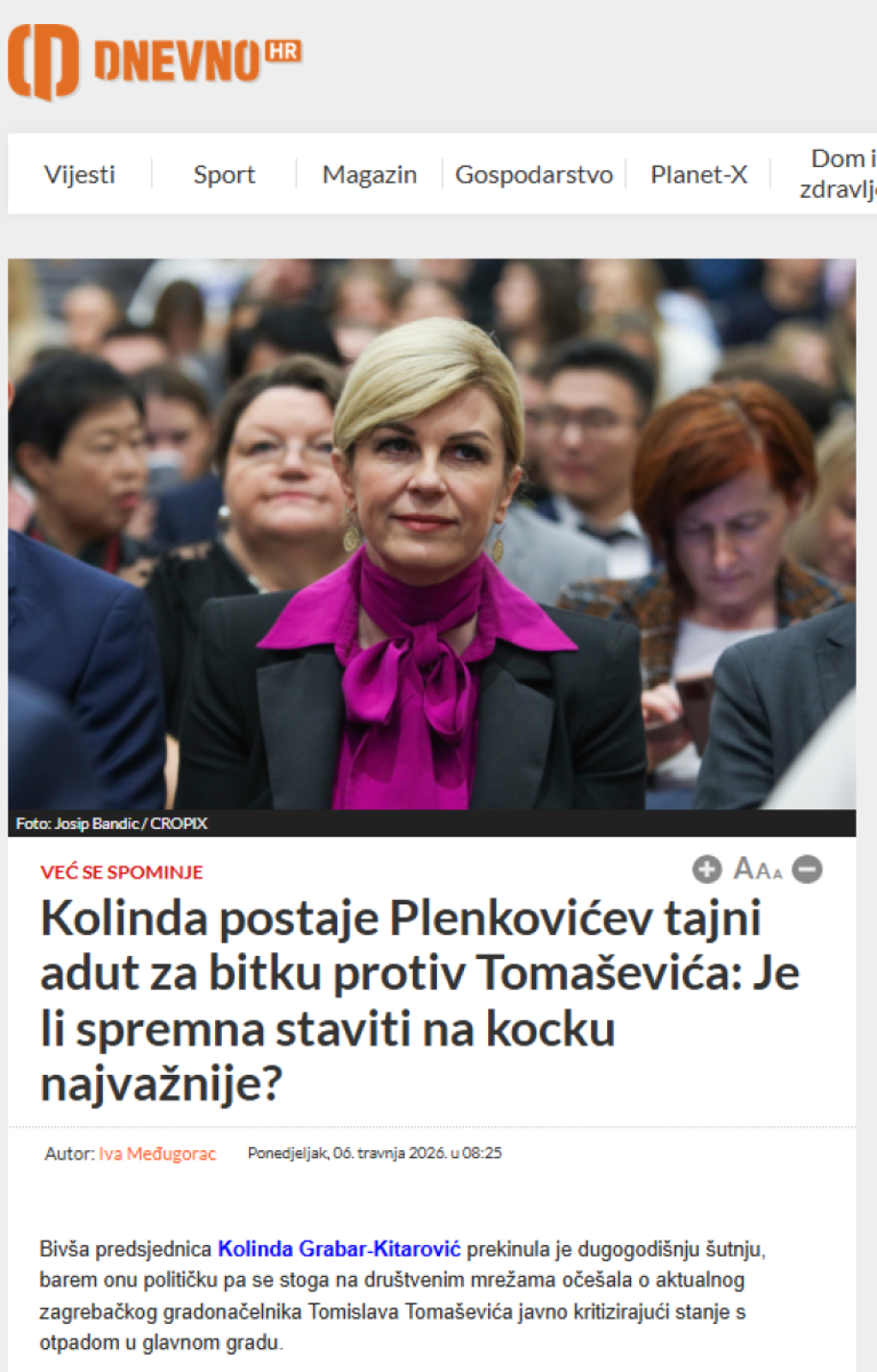 Kako navode, da je novi politički potres u Hrvatskoj na vidiku, potvrđuje to što je Grabar-Kitarović prekinula dugogodišnju tišinu, barem onu političku, i na društvenim mrežama ozbiljno potkačila aktualnog zagrebačkog gradonačelnika Tomislava Tomaševića. Naime, ona je javno kritikovala stanje s otpadom u glavnom gradu i svoj komentar "argumentovala" fotografijama na kojima je prikazano razbacano smeće oko podzemnih podruma ispred njene zgrade.