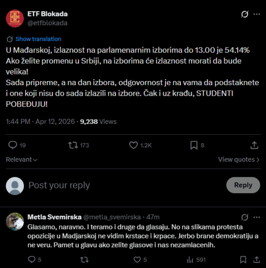 Na društvenoj mreži Iks osvanula je šokantna objava na stranici studenata blokadera Elektrotehničkog fakulteta. Poruka poziva sve da izađu na izbore i podstaknu i one koji do sada nisu glasali, a u jednom delu se čak spominje da "čak i krađa glasova" ne bi smela da spreči pobedu.