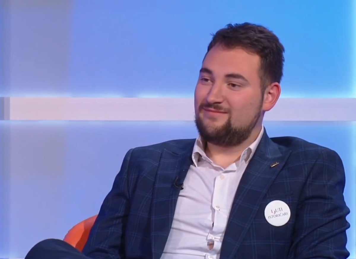 Olja: "Stefan Tomić. Stefan je master student istorije Filozofskog fakulteta Univerziteta u Nišu. Stefane, šta je na Vašem bedžu?"