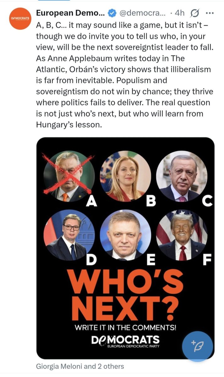 - A, B, C... Možda zvuči kao igra, ali nije, mada vas pozivamo da nam kažete ko će, po vašem mišljenju, biti sledeći suverenistički lider koji će pasti. Kako En Albaum danas piše u časopisu "The Atlantic", Orbanova pobeda pokazuje da je iliberalizam daleko od neizbežnog. Populizam i suverenizam ne pobeđuju slučajno. Oni uspevaju tamo gde politika ne uspeva da ispuni očekivanja. Pravo pitanje nije samo ko je sledeći, već ko će naučiti iz lekcije Mađarske - navodi se u sramnoj objavi evropskih demokrata.