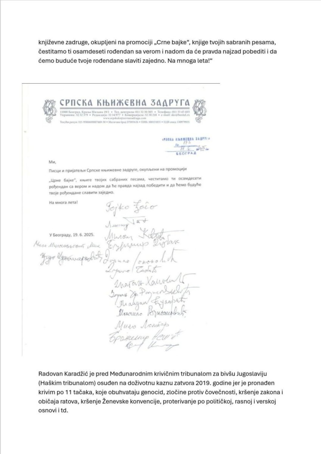 Blokaderi u obrazloženju podsećaju da je Кaradžić pravosnažno osuđen pred Haškim tribunalom na doživotnu kaznu zatvora za genocid i druge teške zločine, te ocenjuju da je „neprihvatljivo da bilo ko ko pretenduje da predstavlja studente relativizuje ili ignoriše tu činjenicu“.