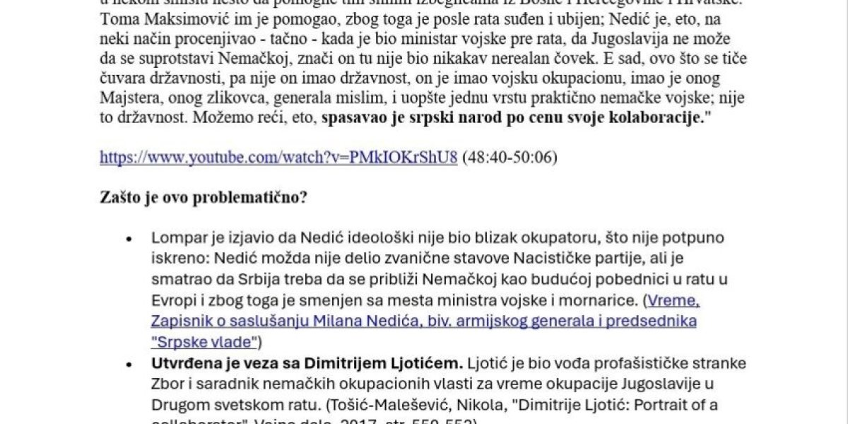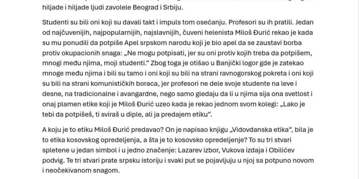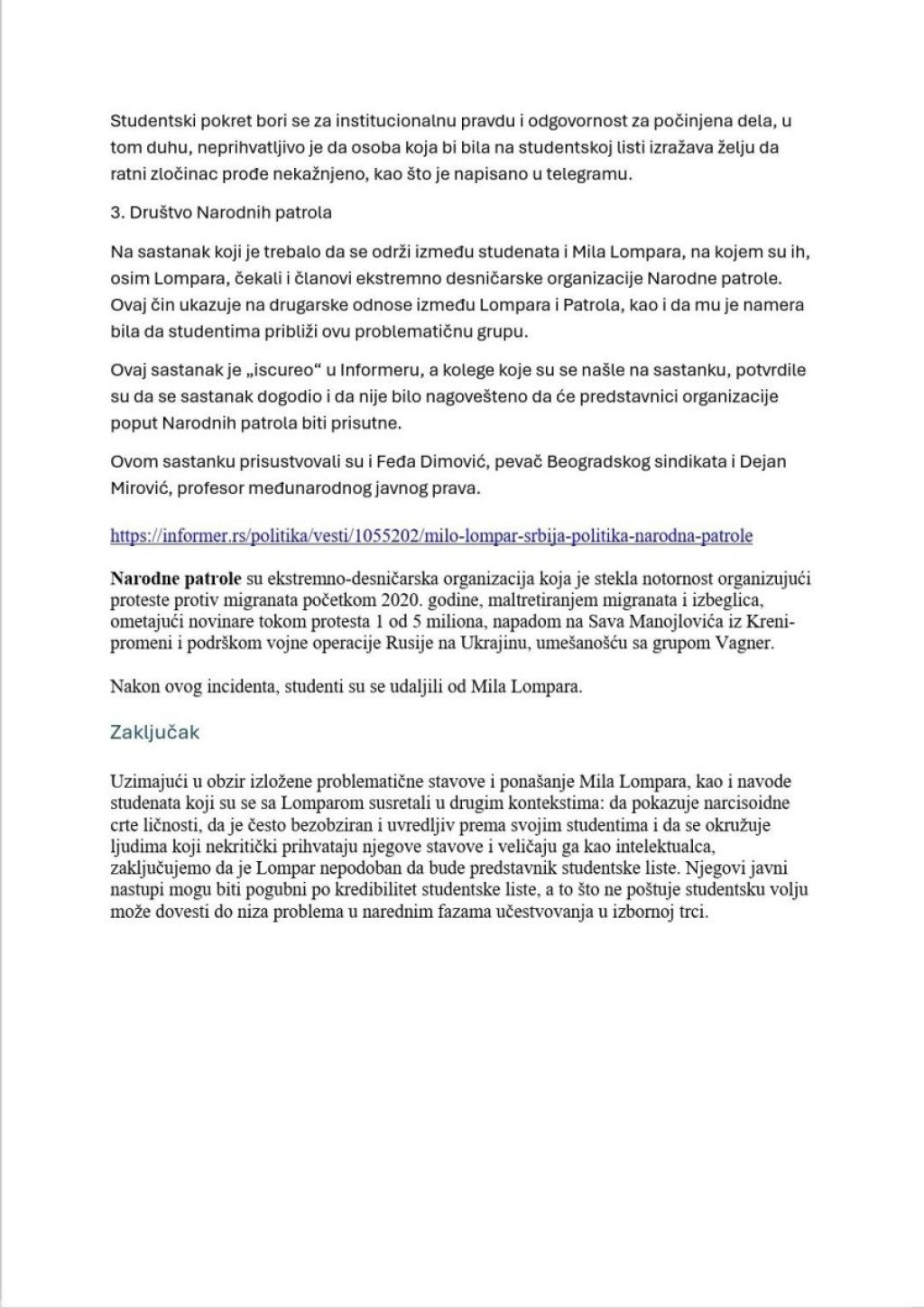 ''Studentski pokret bori se za institucionalnu pravdu i odgovornost za počinjena dela, te je neprihvatljivo da osoba koja bi bila na studentskoj listi izražava stavove koji mogu biti protumačeni kao podrška ratnom zločincu'', navodi se u dokumentu.