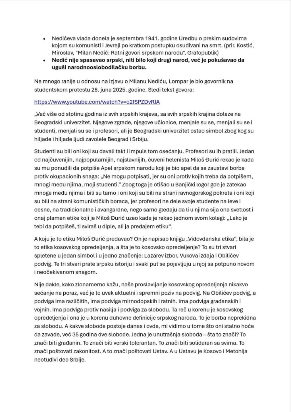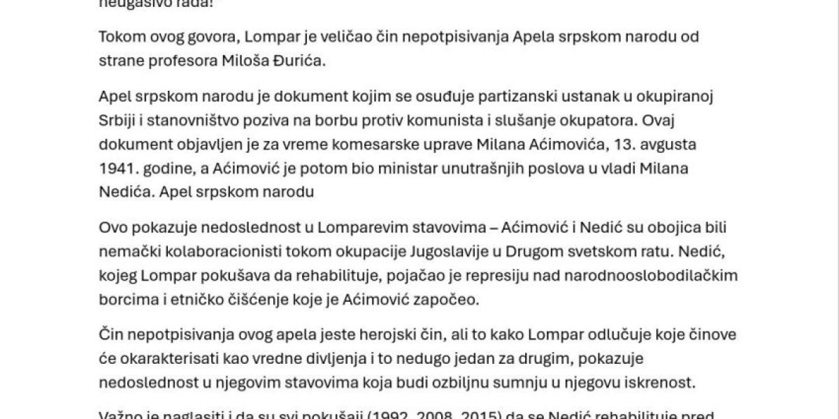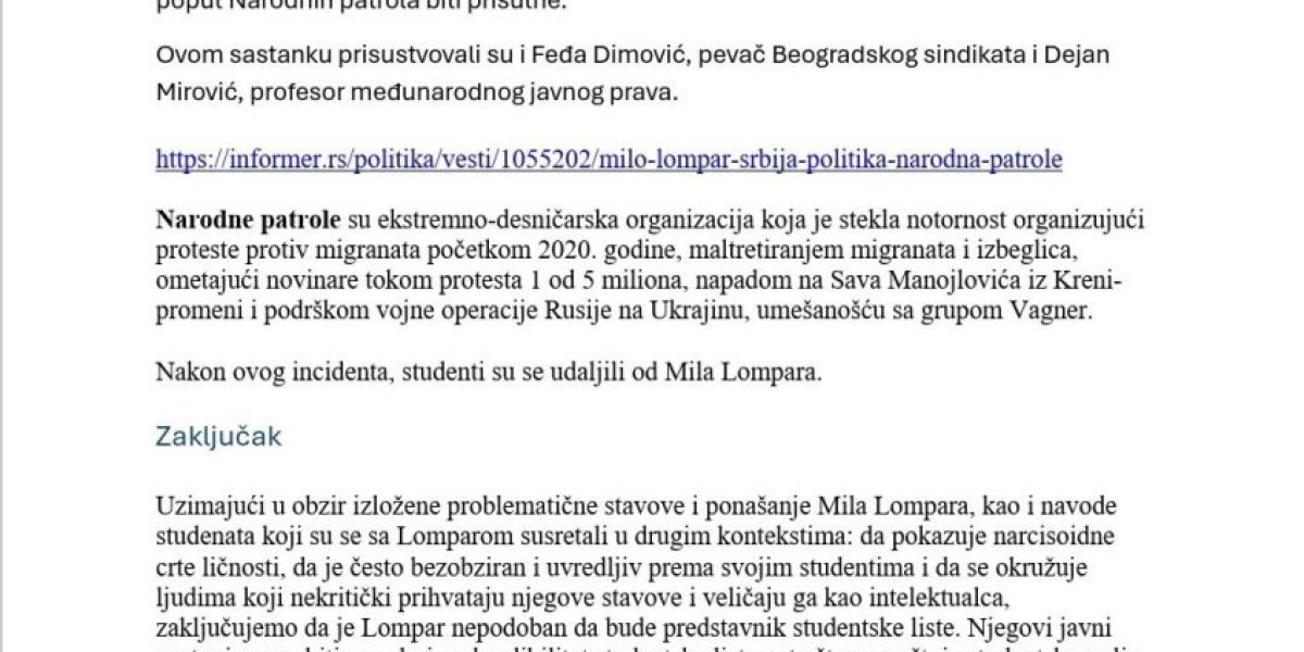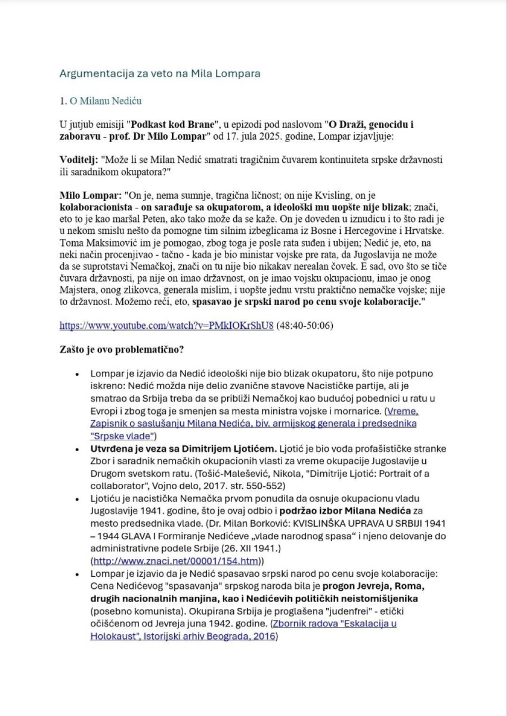 Prema navodima iz dokumenta pod nazivom „Argumentacija za veto na Mila Lompara“, studenti su njegove javne nastupe i političke stavove ocenili kao nespojive sa vrednostima koje žele da zastupaju.