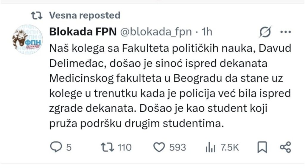 - Naš kolega sa Fakulteta političkih nauka, Davud Delimeđac došao je sinoć ispred dekanata Medicinskog fakulteta u Beogradu da stane uz kolege u trenutku kada je policija već bila ispred zgrade dekanata. Došao je kao student koji pruža podršku drugim studentima - stoji u objavi Blokada FPN.