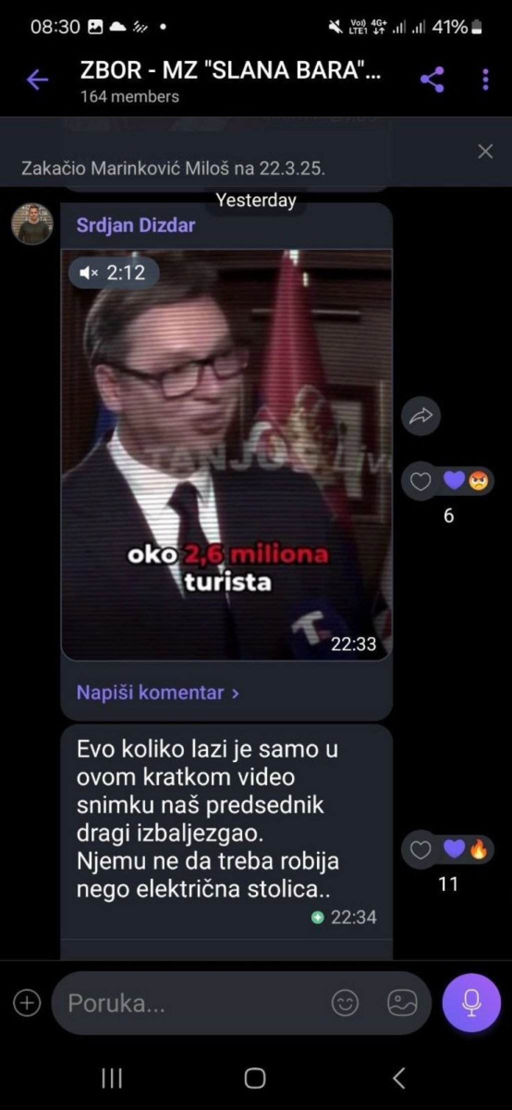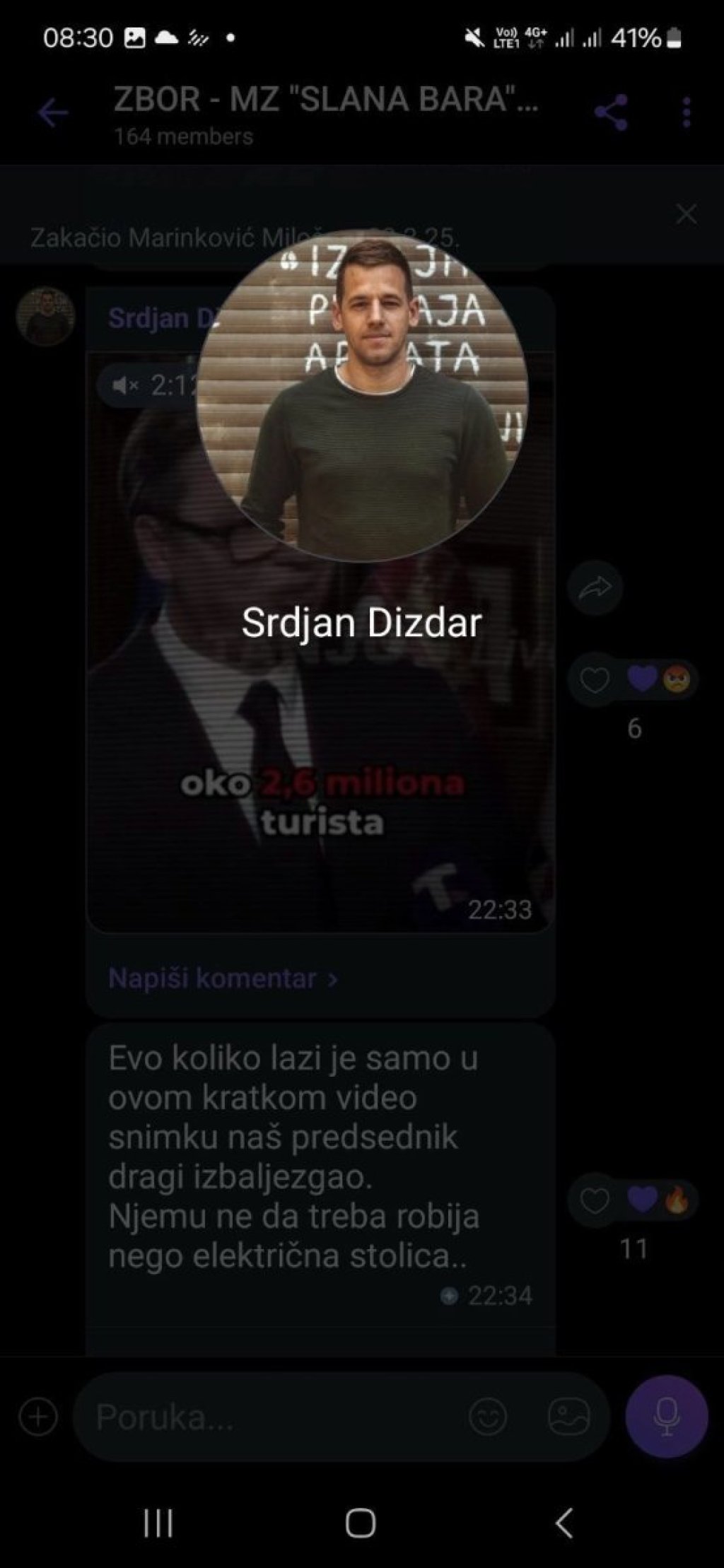 U aprilu prošle godine, on je kao član zbora "MZ Slana Bara" zatvorenim vajber grupama u koje se Informer infiltrirao, objavio jeziv komentar na račun šefa države.