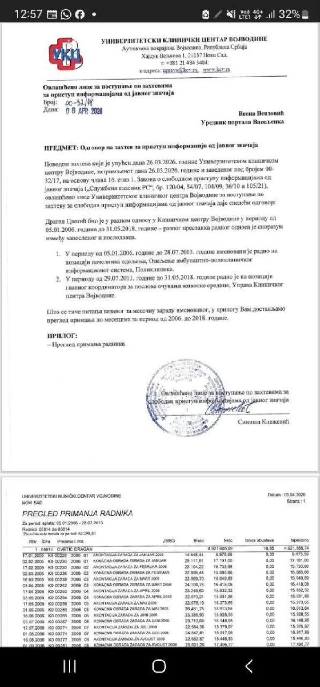 Na osnovu zakona o pristupu informacijama od javnog značaja ekipa Informera je u saradnji sa kolegama iz "Vaseljenske" došla do potvrde da je Cvetić zaista bio zaposlen u Univerzitetskom kliničkom centru Vojvodine, što se može videti i na fotografiji ispod.