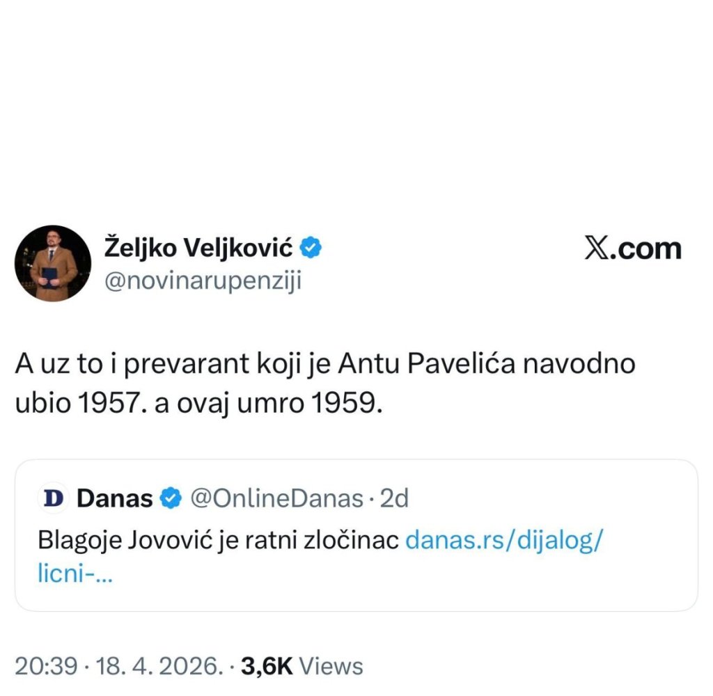 - A uz to je i prevarant koji je Antu Pavelića navodno ubio 1957, a ovaj umro 1959. - napisao je Veljković na Iksu, deleći istovremeno objavu Danasa.