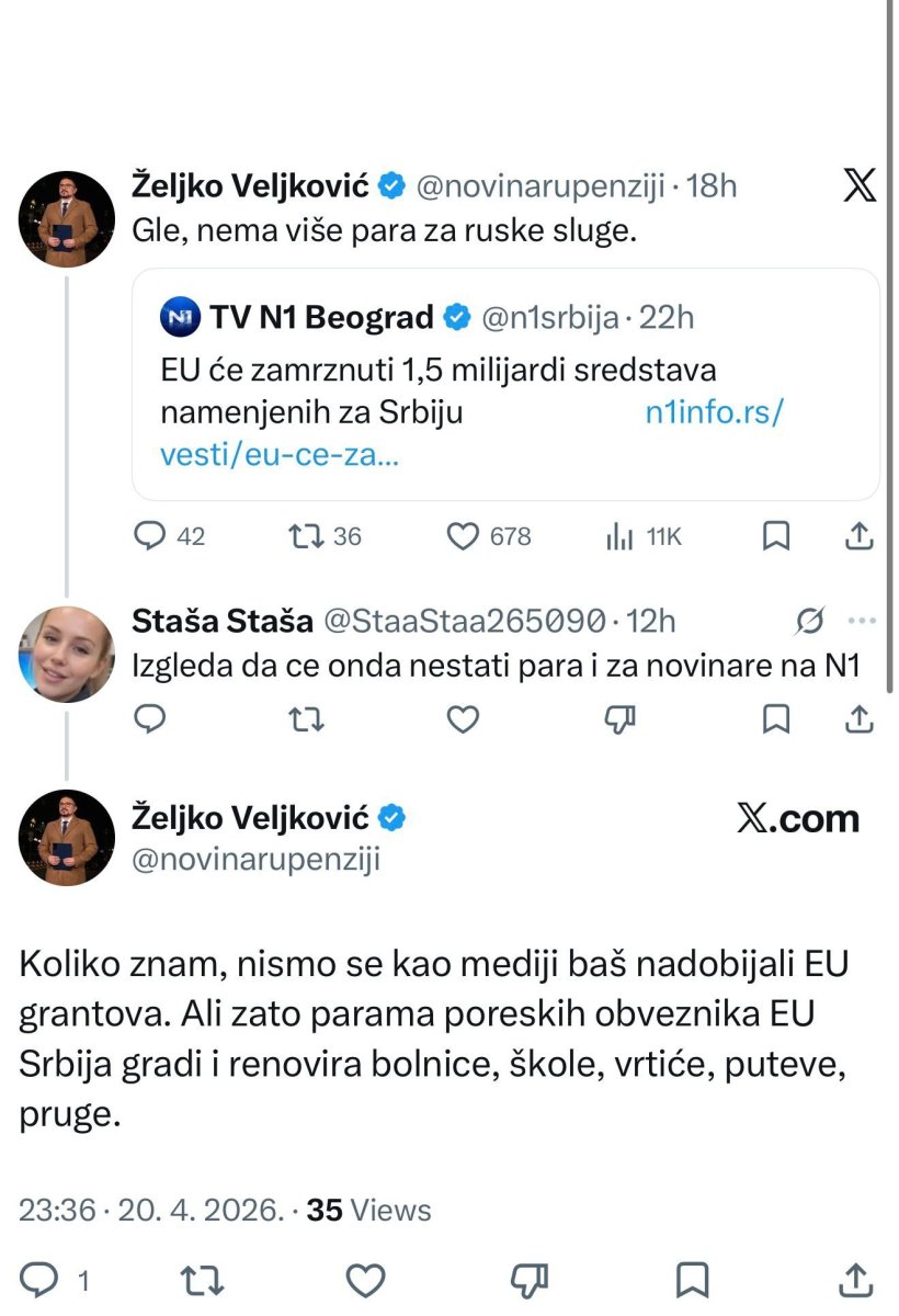 On je komentarisao da Evropska unija potencijalno razmatra zamrzavanje oko 1,5 milijardi evra finansijske pomoći iz "Plana rasta" za Srbiju, uz reči "Gle, nema više para za ruske sluge".