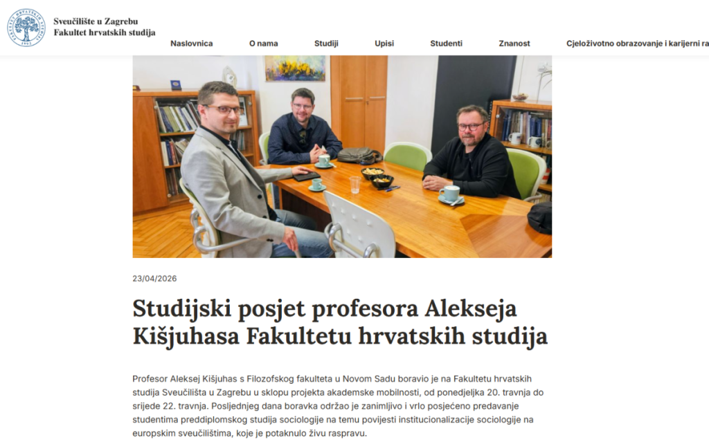 - Profesor Aleksej Kišjuhas s Filozofskog fakulteta u Novom Sadu boravio je na Fakultetu hrvatskih studija Univerziteta u Zagrebu u sklopu projekta akademske mobilnosti, od ponedeljka 20. aprila do srede 22. aprila. Poslednjeg dana boravka održao je zanimljivo i vrlo posećeno predavanje studentima preddiplomskog studija sociologije na temu istorije institucionalizacije sociologije na evropskim univerziteta, koje je podstaklo živu raspravu - istaknuto je na zvaničnoj stranici Univerziteta u Zagrebu.