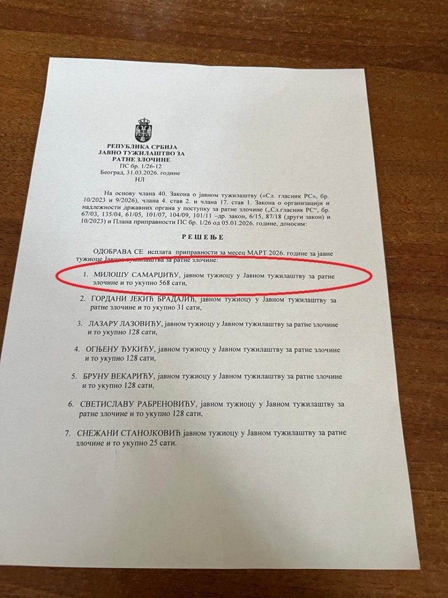 Podsećamo, portal „Vaseljenska“ je razotkrio da je javni tužilac Miloš Samardžić sebi upisao neverovatnih 568 sati pripravnosti za samo jedan mesec, konkretno mart 2026. godine, kao i da je za naredni mesec april, koji u momentu pisanja članka je tek nastao, upisao takođe dodatnih 544 sata pripravnosti, pored osnovnih 128 sati.